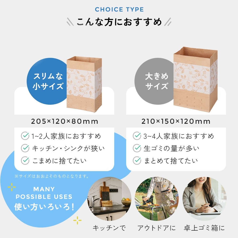 これより小さなサイズがあるといいのにな。サイズが大小あって、選べられたらいいのにな。まとめ買いが、もっとお得感があるといいのにな。ぬれても全然破けなくて、すばらしいです