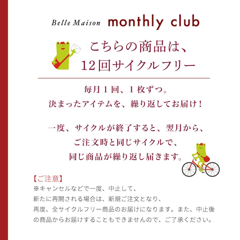 ※毎月1回、1足ずつお届けします。13回目以降は、それぞれのアイテムを繰り返しお届けします。お届けはお客様のお好きなときまで。
