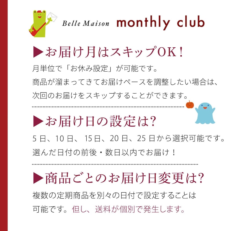 毎月のお届けは 5日、10日、15日、20日、25日から選択可能です。 継続利用のある場合、マイページよりご確認ください。