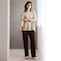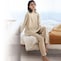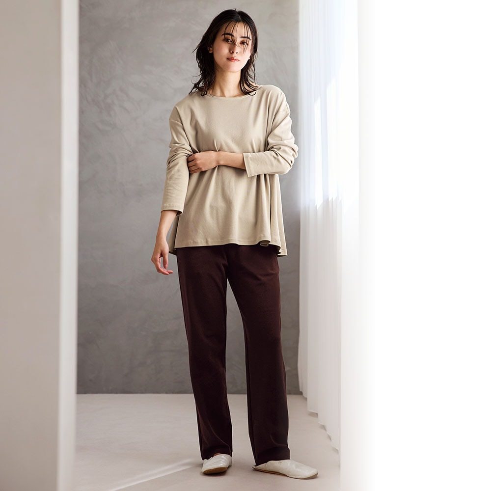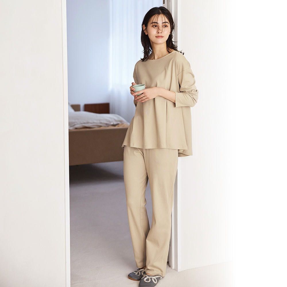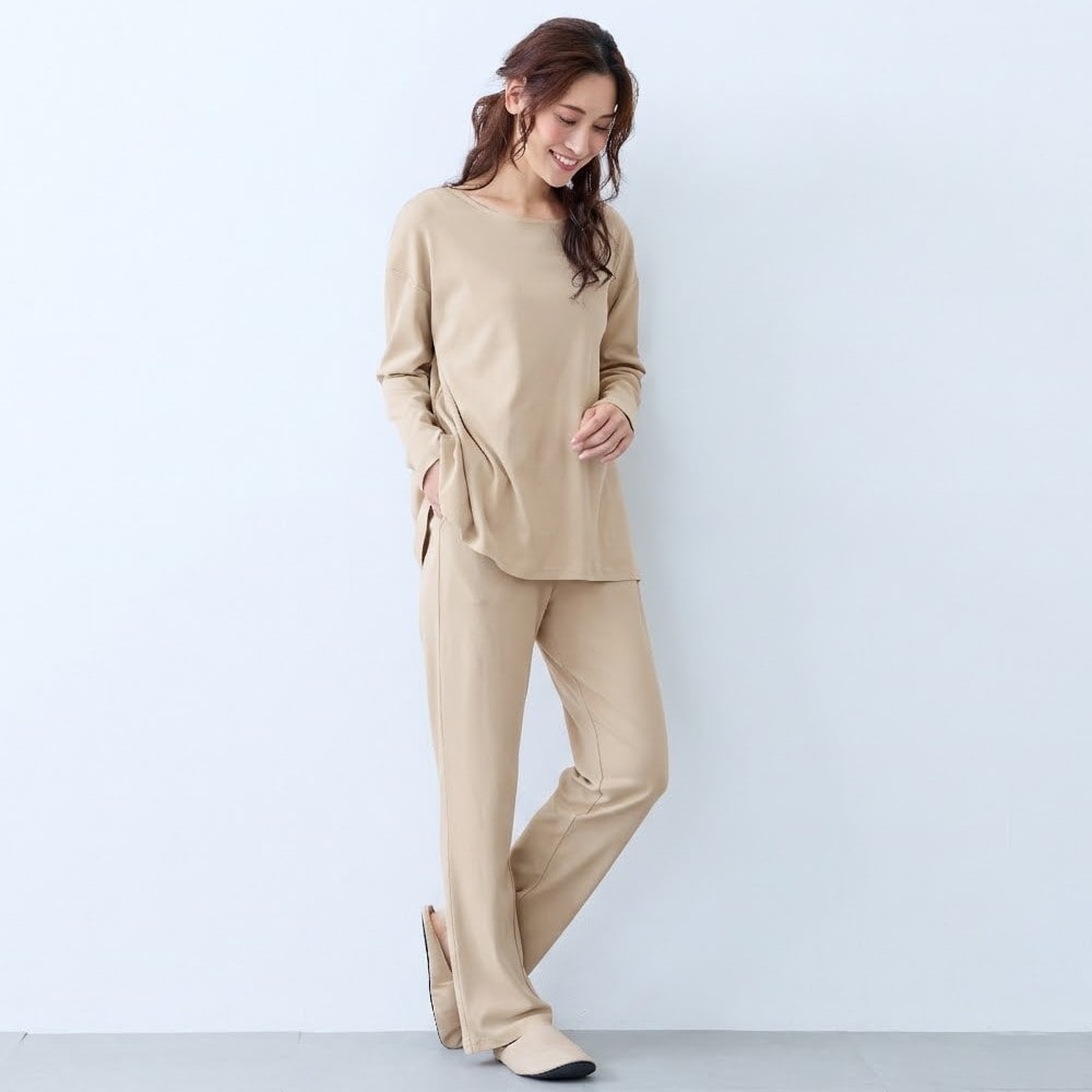 とても柔らかくて気に入っています。デザインはシンプルですが、上衣の裾はもう少し広がりを抑えたほうが、すーすーしなくていいかなと私は思いました。