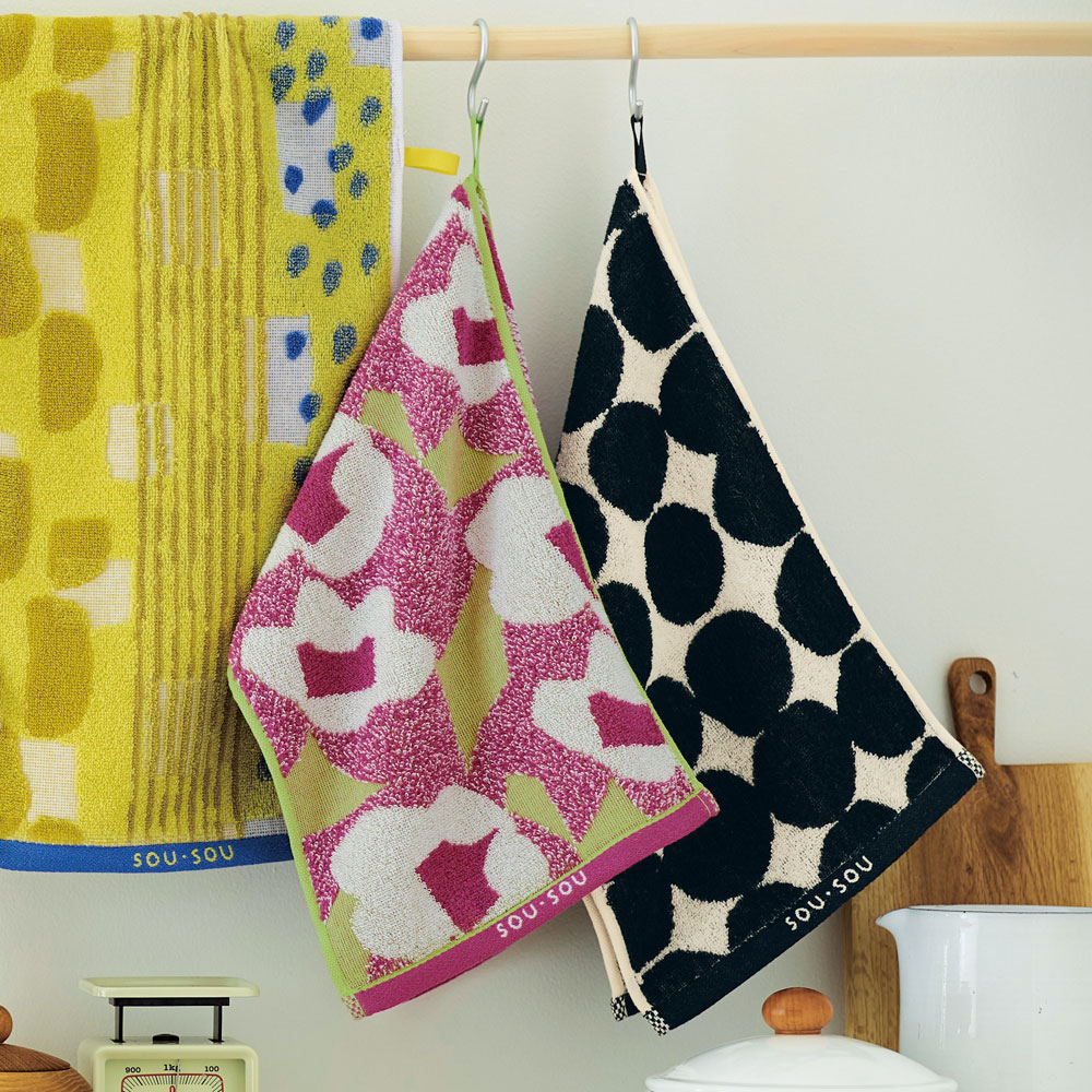 SOU・SOUのポップなテキスタイルがタオルに。キッチンや洗面所に掛けたり、吊るしたりしやすいスリム幅。