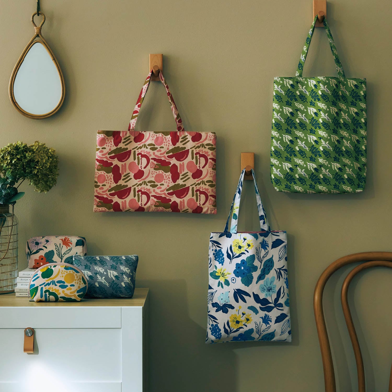 色違いのお揃いを一緒に持ち歩いても楽しいトートバッグ&ポーチ。