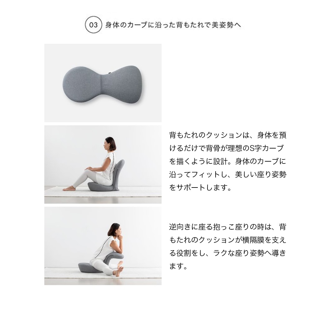 ●お尻がすっぽり収まる立体クッション設計の座面と、背骨をS字カーブへ導く背もたれが姿勢崩れを防止。