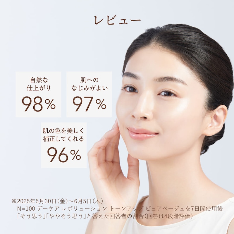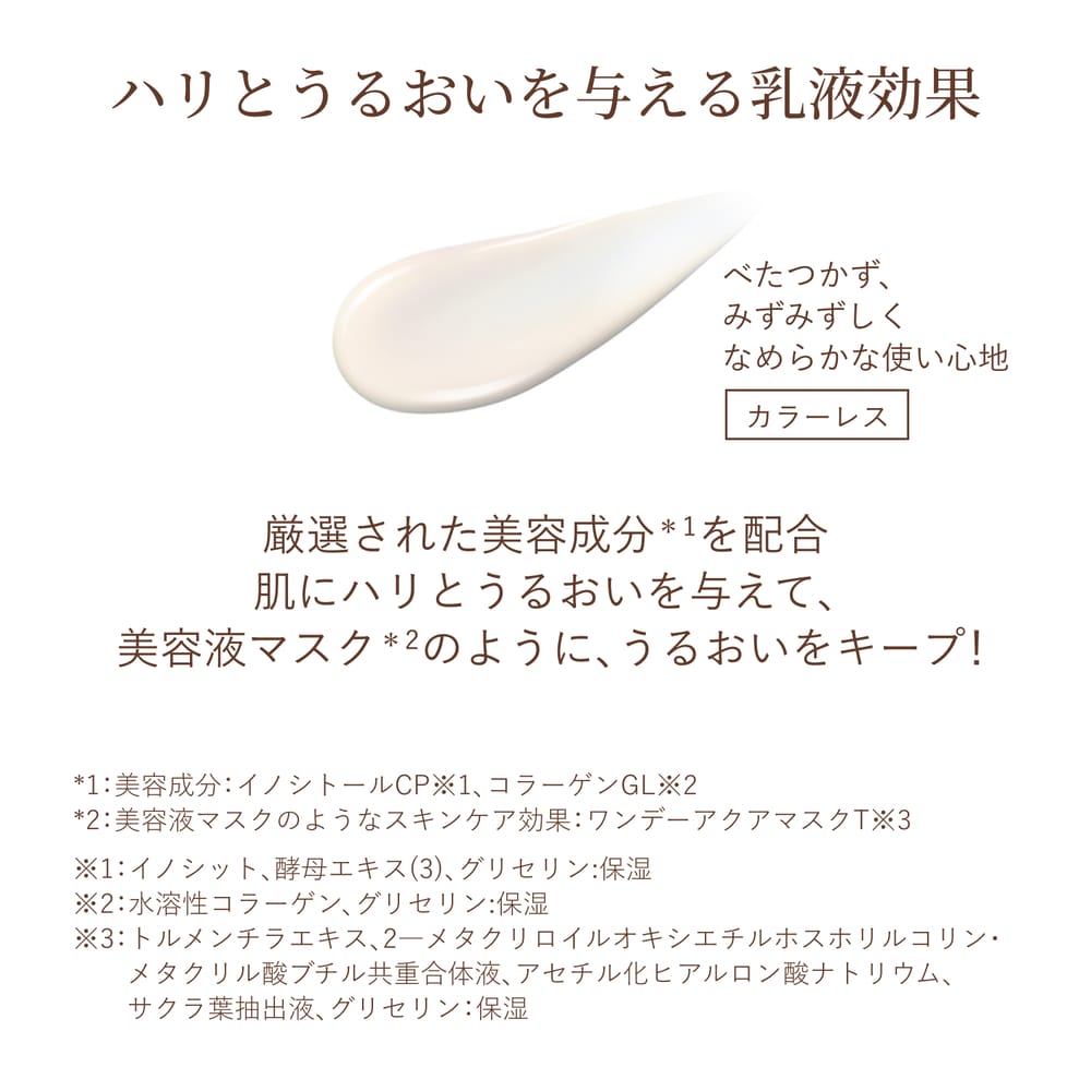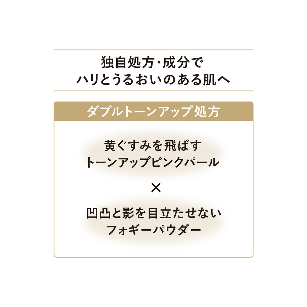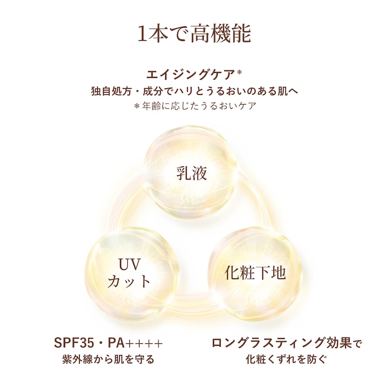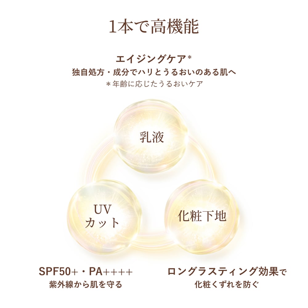 トーンアップとハリ、シミ補正仕上げ。乳液・化粧下地・UVカットに、トーンアップ効果まで。大人の肌のシミ・色ムラや影を瞬時にカバーし、明るくハリに満ちた印象へ。肌にすばやくなじみ、みずみずしい使い心地。乾燥による小ジワを目立たなくします*。洗顔料・石けんで落とせます。