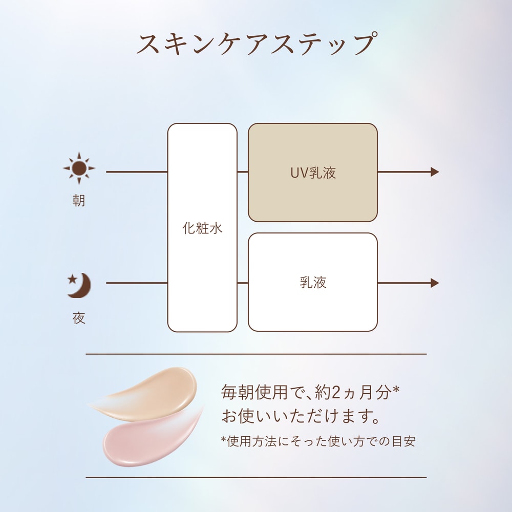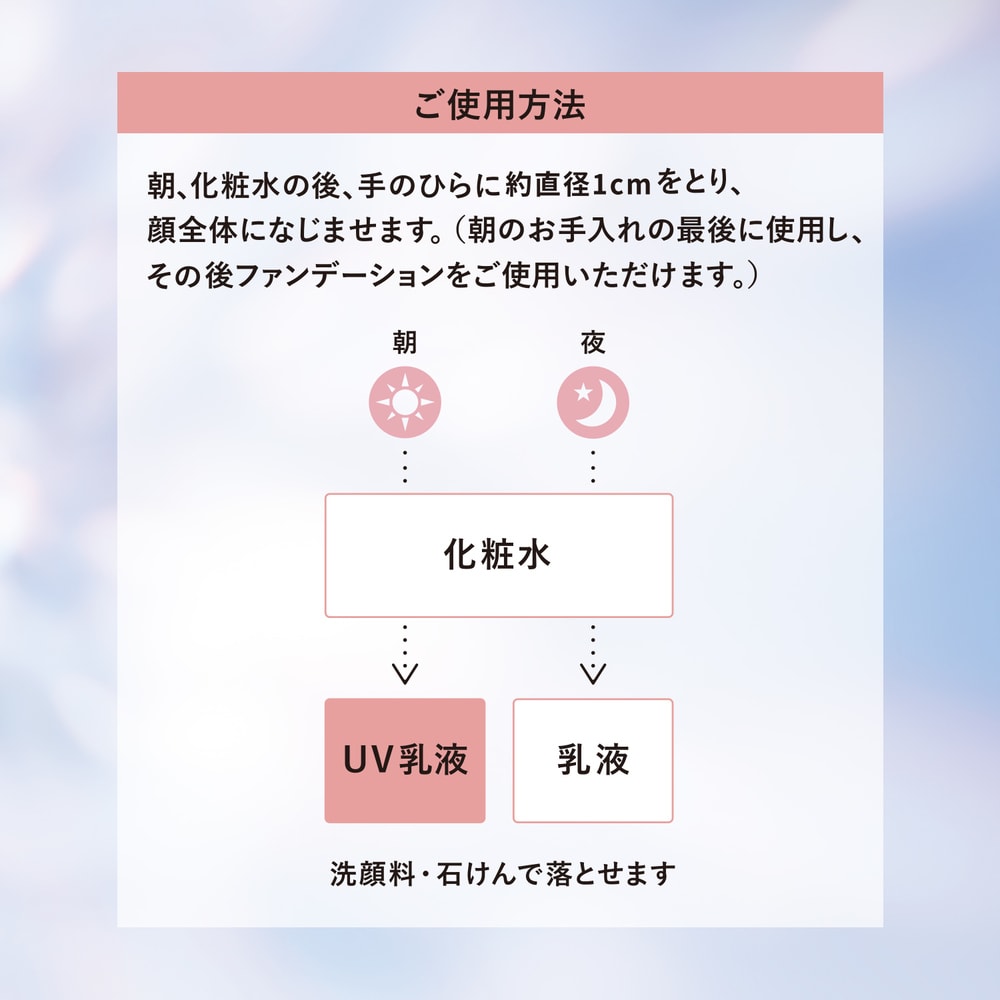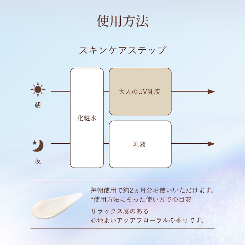 ●朝、化粧水の後、手のひらに直径約1cmをとり、顔全体になじませます。(朝のお手入れの最後に使用し、その後ファンデーションをご使用いただけます。)