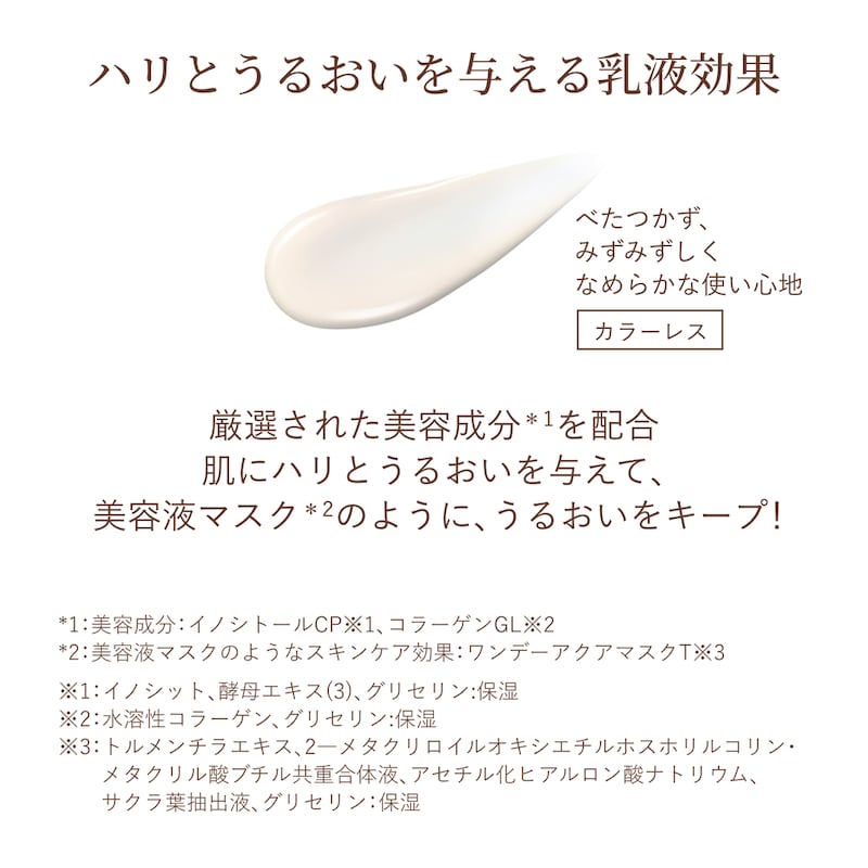 ●1本で高機能。ふっくら柔らか美肌。ハリとうるおい。乳液・化粧下地・プロテクターの3つの効果が1本に。大人の肌のハリのなさや乾燥をケアし、ふっくら柔らかハリ美肌へ。乾燥による小ジワを目立たなくします*。べたつかず、みずみずしいなめらかな使い心地。*効能評価試験済み。リラックス感のある心地よいアクアフローラルの香り