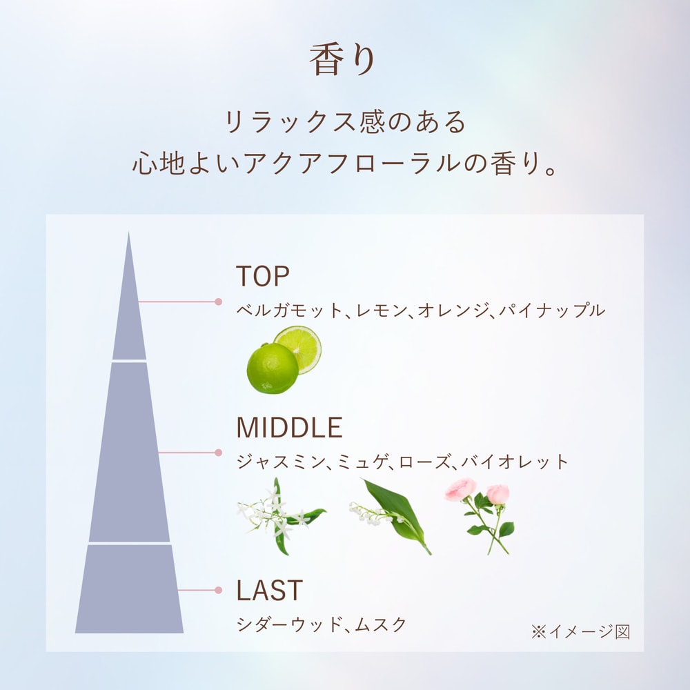 *効能評価試験済み。SPF50+・PA++++、ピュアベージュ、リラックス感のある心地よいアクアフローラルの香り