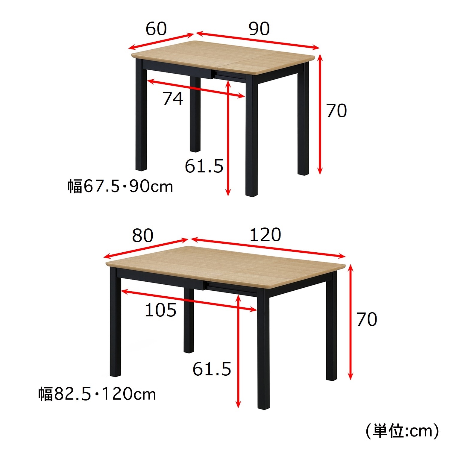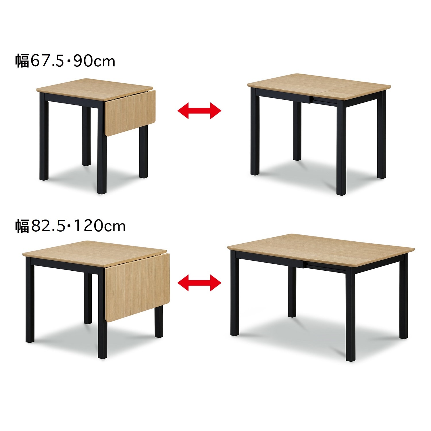 天板は幅67.5・90cm、幅82.5・120cmに伸長できます。/ナチュラル×ブラック