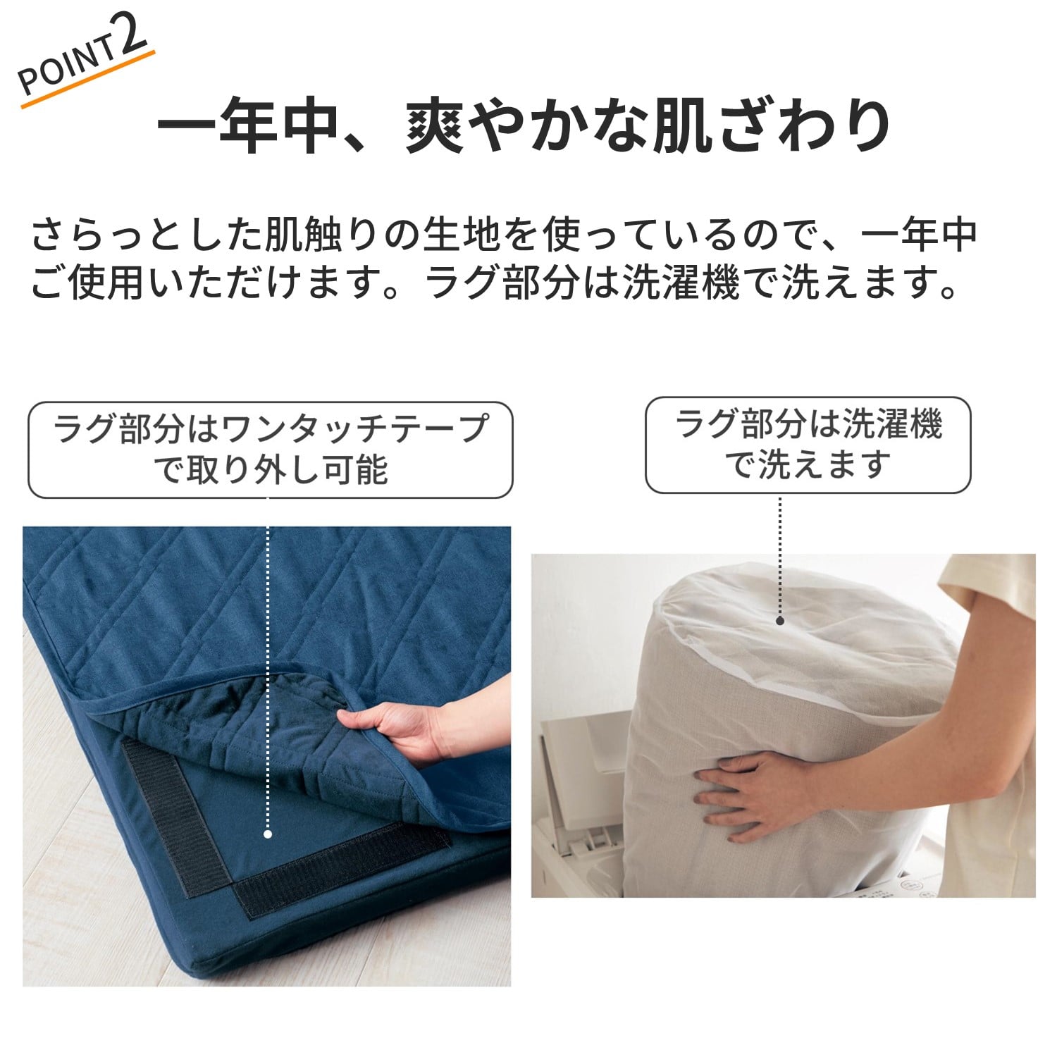 子供と過ごすリビングに。汚れが目立たず、気軽に洗えて、転んでもはしゃいでも問題なく、年中過ごせる素材のものを探していて見つけました。使い心地はとても良いのですが、ラグしか洗えないことに気付きませんでした。違う商品だったのかな?背もたれのカバーは洗えないし換えも売ってないんですね。残念です。
