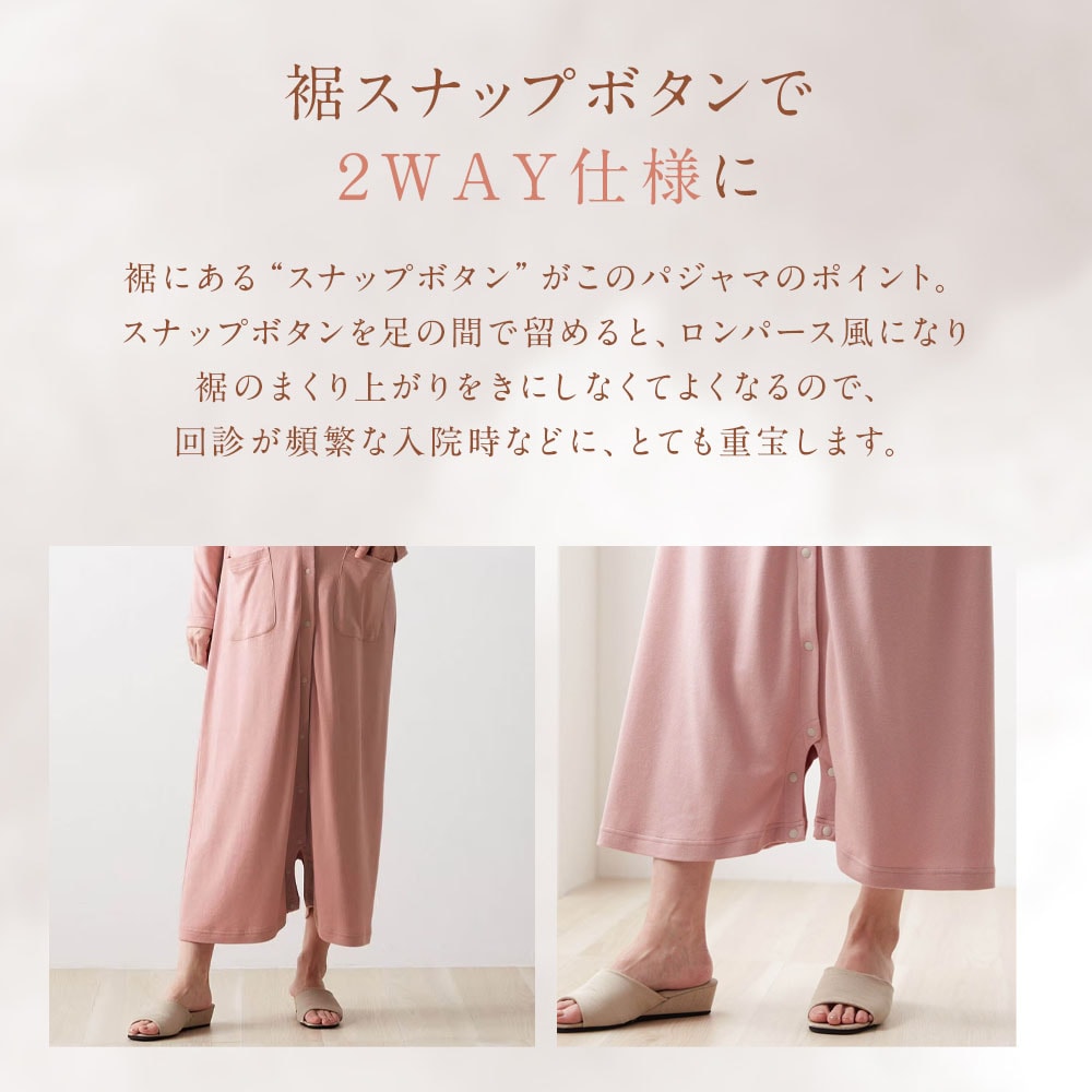 とっても肌触りがいいです!するっと着れて軽いです。足の間でボタンが留めれるところが画期的!起きたらいつもお腹が出ていて寒いけどズボンは嫌だ、と思ってので最高です。袖が留められるところも洗い物をするときに便利!