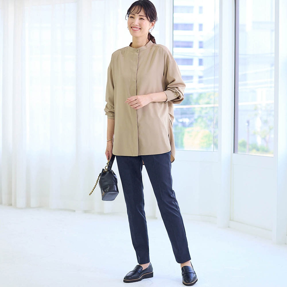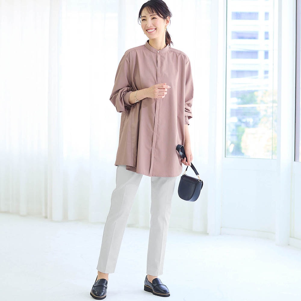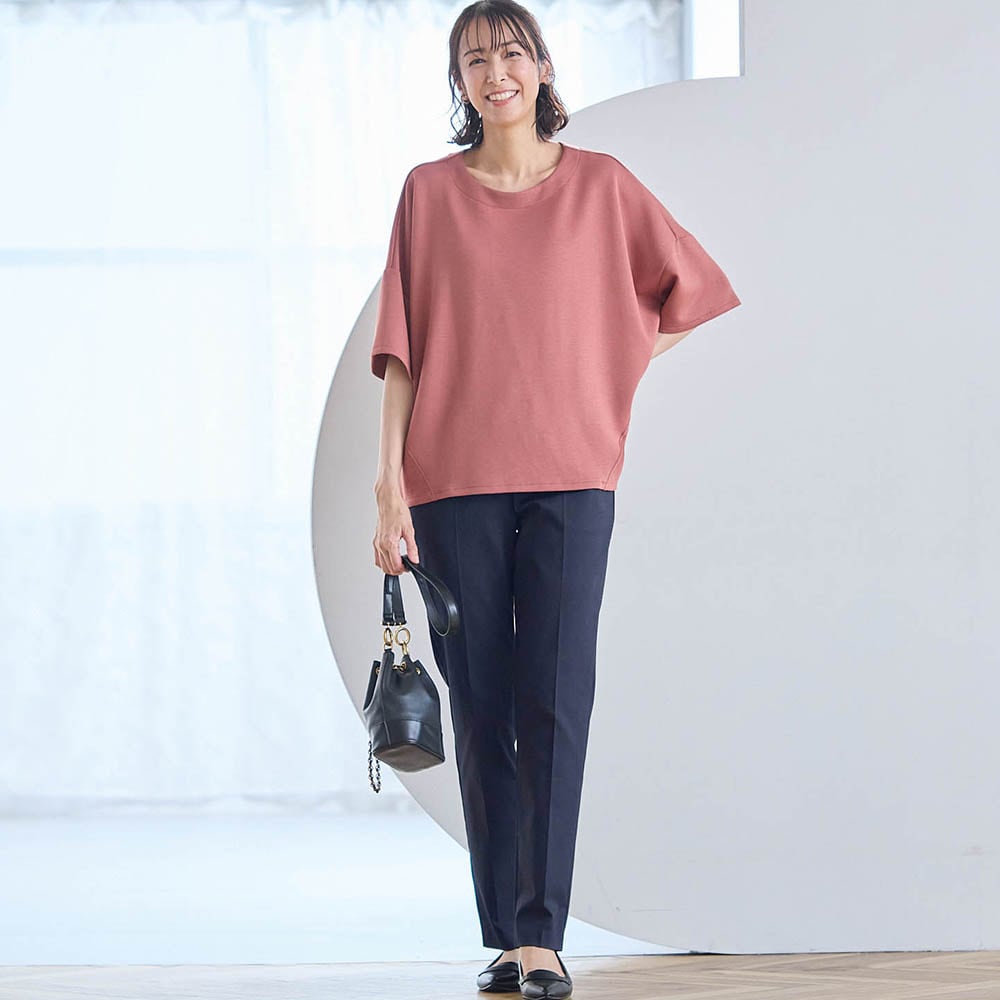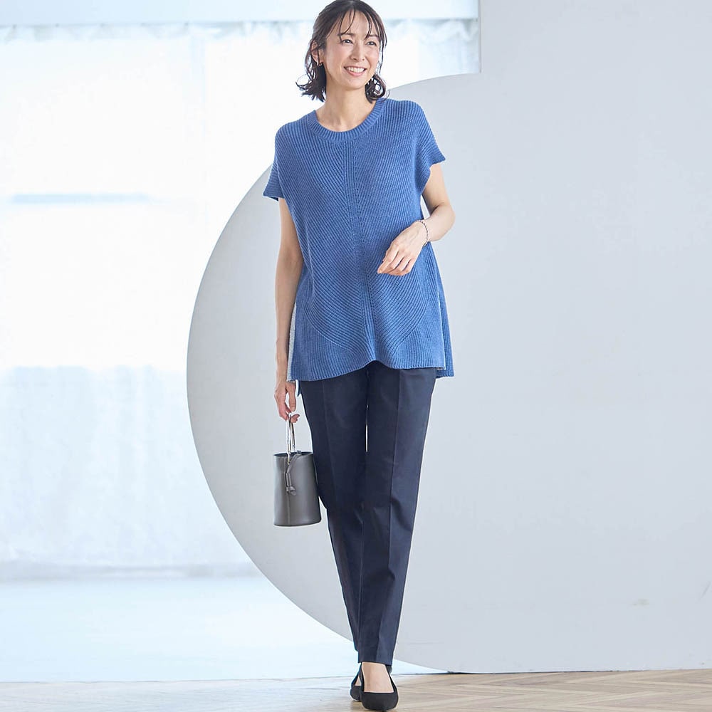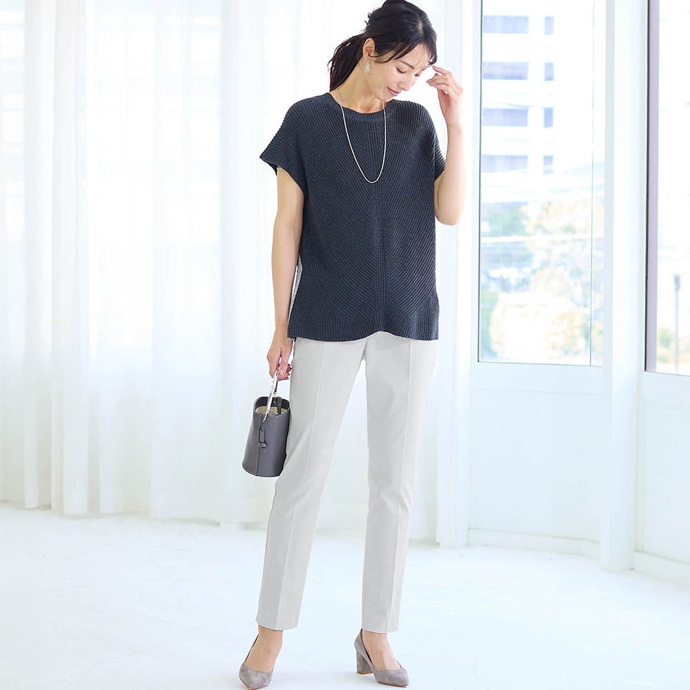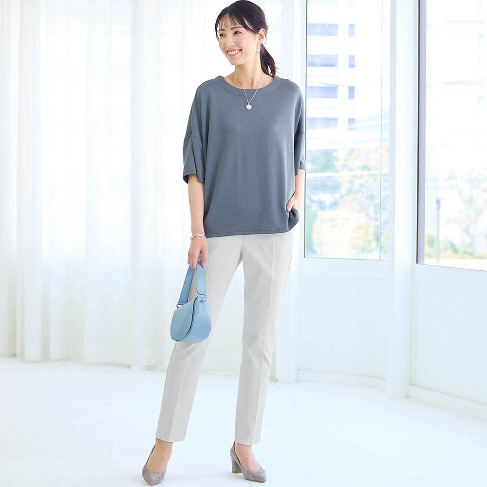 材質は作業着やユニフォームに使われているちょっとゴツめの生地です。ゴワつくかなと思ったのですが、穿くと見た目より柔らかくさらっと着用できます。 また、カッティングが良いのか、太ももから腰回りがほっそり+若干足長に見えます。週3でゴミ捨て場で出会うご近所さんに「やせた?素敵ね。」と言われました。色も濁りのない明るいライトグレーなので様々なトップスに合わせやすく着回し力最高です。欲を言えばウエストの黒いゴムは身生地で作って欲しかったと思います。