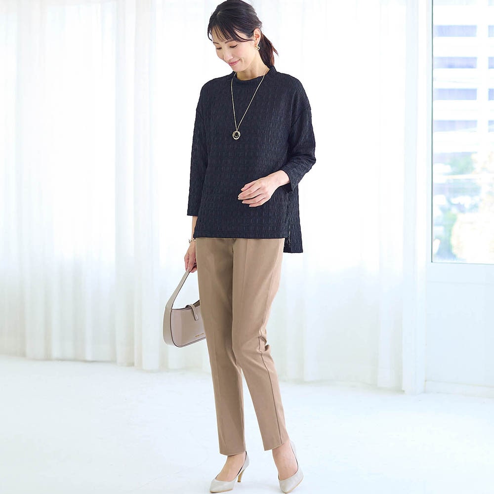 商品のご購入、ならびにレビューへのご投稿ありがとうございます。 ストレッチ性に関しまして、購入前の商品イメージと実際の印象が異なり、誠に申し訳ございません。一方でデザインについてはお気に召していただき嬉しく思います。 こちらの商品は、ポリエステル5%の商品でストレッチ性はございますが、身体のラインを拾いにくいしっかりめの生地を使用しております。 カットソーのようなぐんぐん伸びるストレッチとはいきませんが、動きやすさも考慮したストレッチ性をもたせつつ、ひざが出にくいような生地選定をしておりました。しかしながら、素材のイメージをきちんとお伝えすることができておらず申し訳ございませんでした。また、お座りの際に裾があがってきてしまうということに関しまして、ご満足いただけるものとなっておらず重ねてお詫び申し上げます。 いただいたご意見を真摯に受け止め、次回の商品開発の改善に努めます。 今後もお客様により満足度の高い商品をお届けできるよう努力をしてまいります。貴重なご意見ありがとうございました。