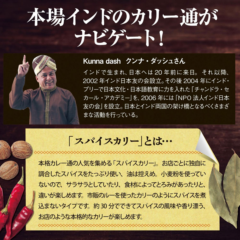 ●セット内容/特製カリーベース250g、オリジナルスパイスミックス6g、ホットスパイス2g、カラーレシピ