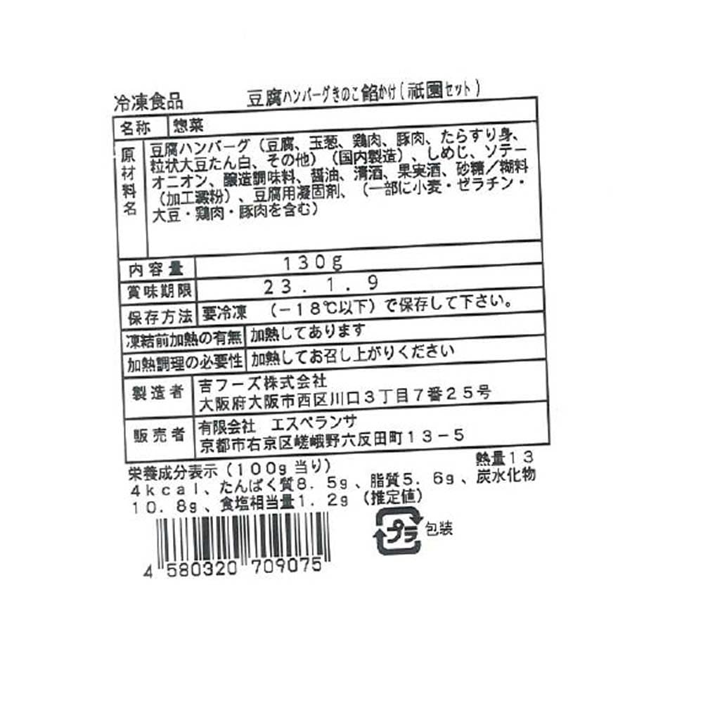 豆腐ハンバーグきのこ餡かけ:炒めた玉ねぎと白ワインがきのこと共に豆腐ハンバーグに合うソースに仕上げました。