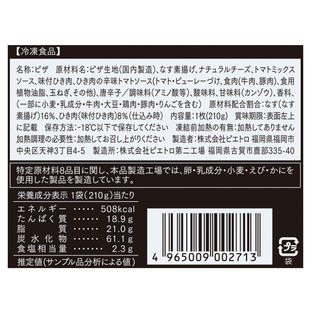 ・なすとひき肉の辛味トマトソース:ジューシーな揚げなすとピエトロ特製の甘辛く味付けたひき肉、唐辛子の効いたスパイシーなトマトソースが絶妙にマッチするおいしさのピザ。