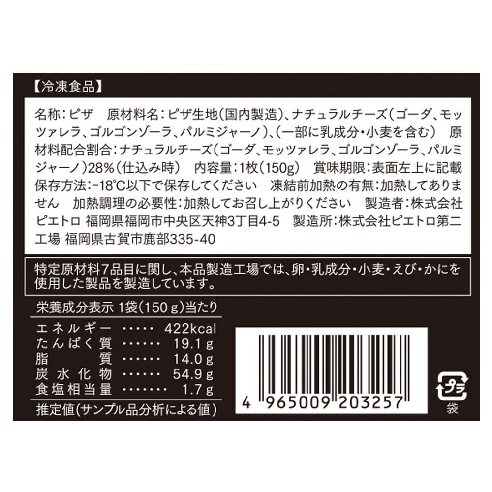 ・クワトロフォルマッジ 4種のチーズ:ゴーダ、モッツァレラ、ゴルゴンゾーラ、パルミジャーノの4つを贅沢に使用した、チーズ好きにはたまらないピザ。