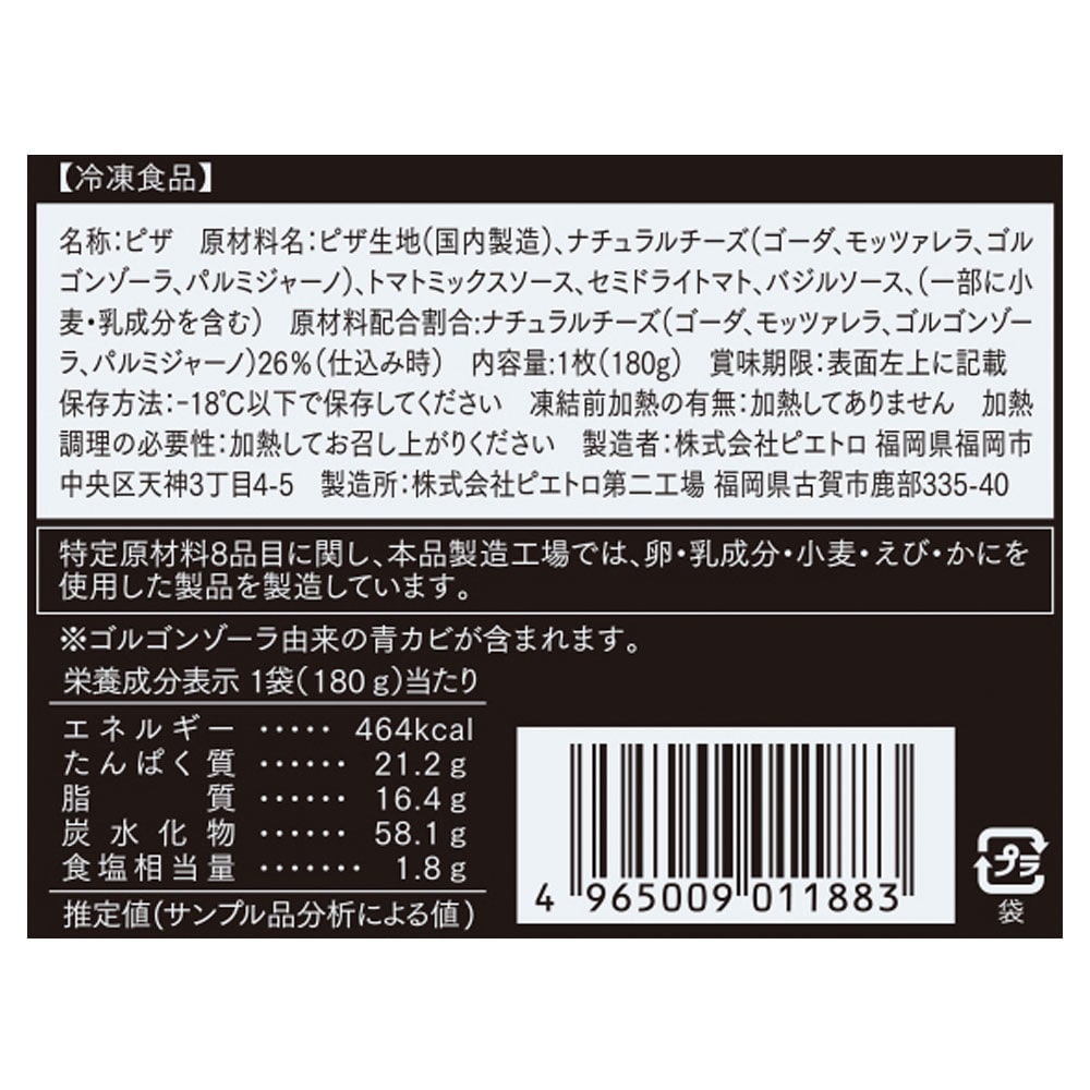 ●マルゲリータ ドライトマトとフレッシュモッツァレラ (205g 直径約19cm)、なすとひき肉の辛味トマトソース(210g 直径約19cm)、博多辛子明太子とフレッシュモッツァレラ(173g 直径約19cm)、クワトロフォルマッジ 4種のチーズ(150g 直径約19cm)、マルゲリータ&クワトロフォルマッジ(180g 直径約19cm)×各1個(計5個)