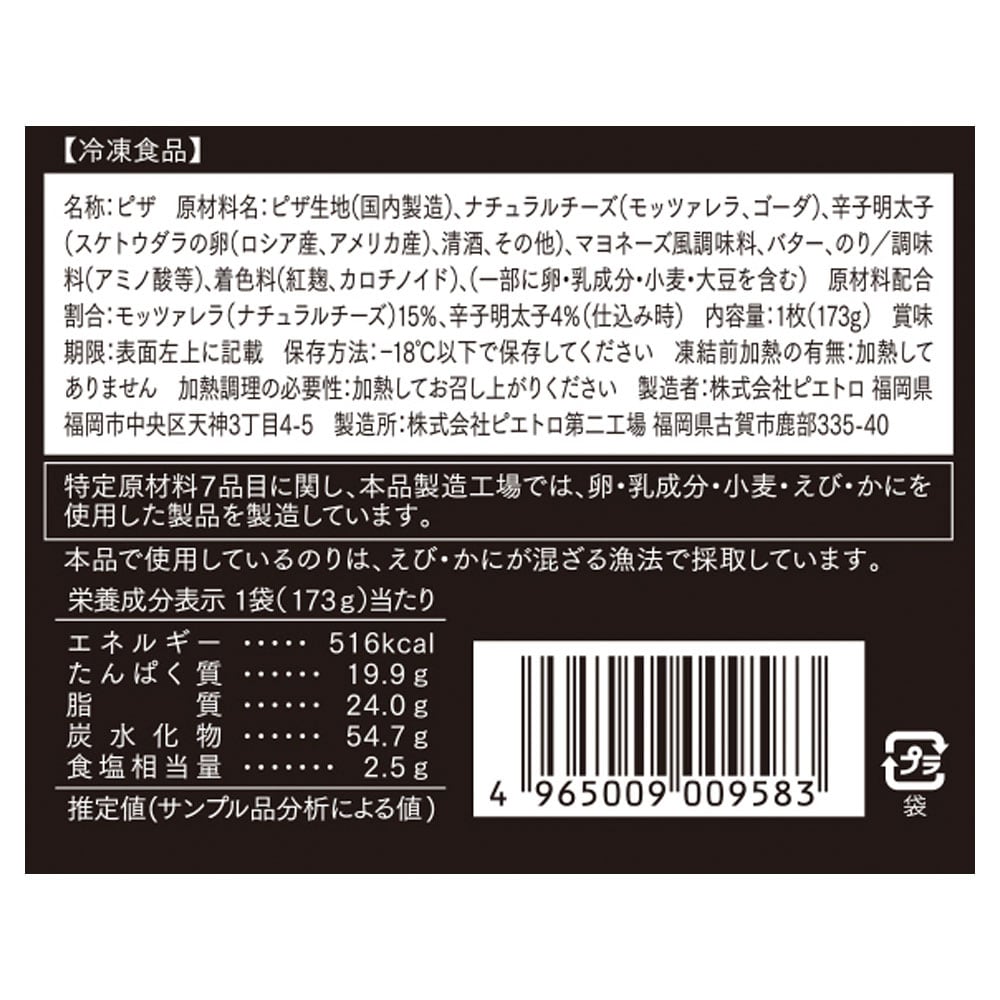・博多辛子明太子とフレッシュモッツァレラ:博多辛子明太子と、とろ~り糸引く北海道十勝産モッツァレラ※、有明海産焼き海苔をトッピングした和風ピザ。※原材料のナチュラルチーズのうち50%が北海道産モッツァレラです。