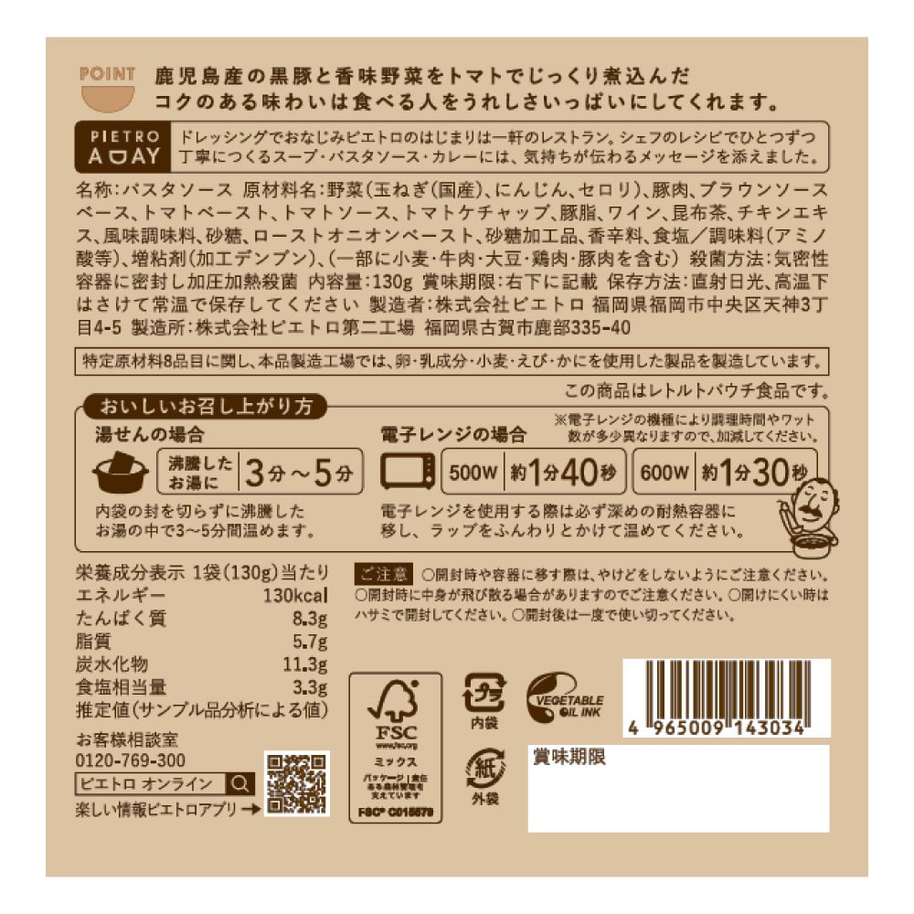 ●国産紅ずわい蟹と蟹みその芳醇トマトソース PIETRO A DAY(140g)・鹿児島産黒豚の本格ボロネーゼ PIETRO A DAY(130g):各2袋、国産真鰯と香味野菜の本格ペペロンチーノ PIETRO A DAY(110g)・ピエトロ風ナポリタン ーデミグラスソース仕立てー PIETRO A DAY(130g)・5種のチーズの濃厚カルボナーラ PIETRO A DAY(135g):各1袋(計7袋)