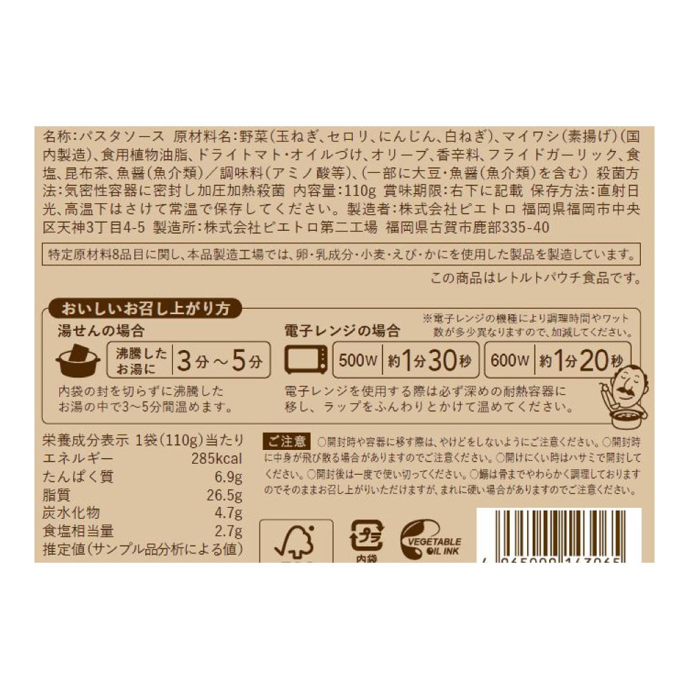 ・国産真鰯と香味野菜の本格ペペロンチーノ PIETRO A DAY:ごろっと入った国産真鰯の旨みと、ガーリックオイルの辛味がクセになるソース。