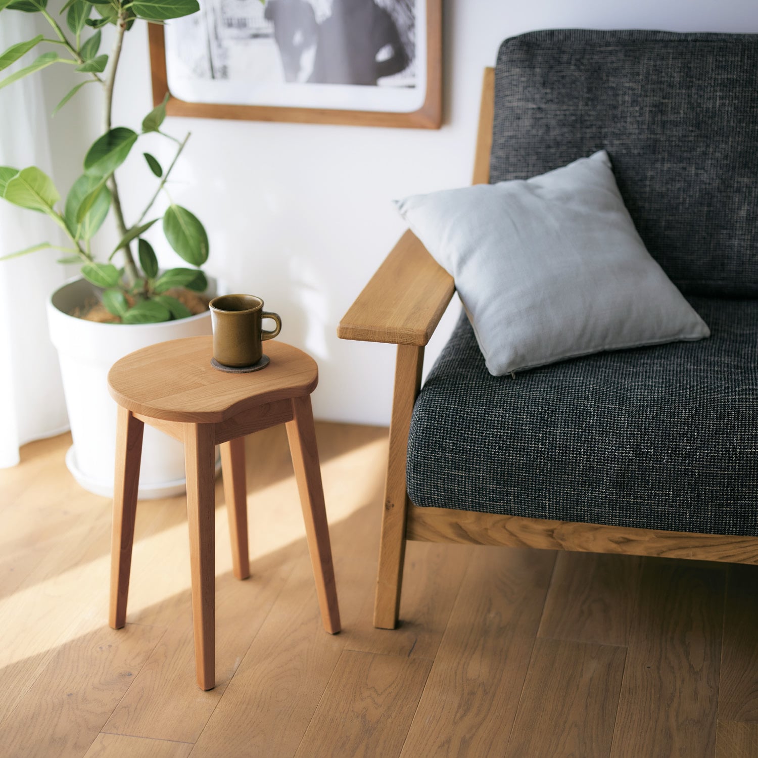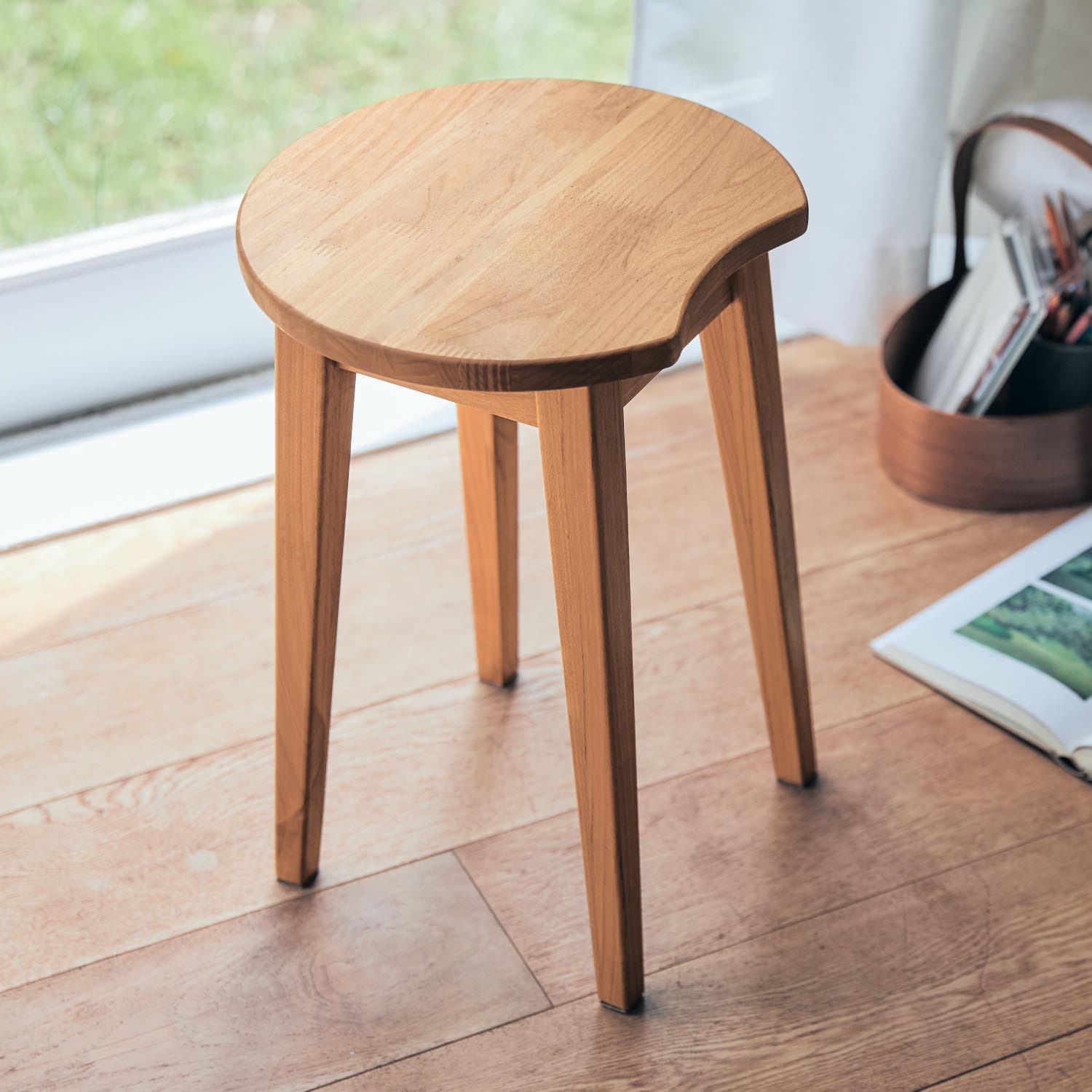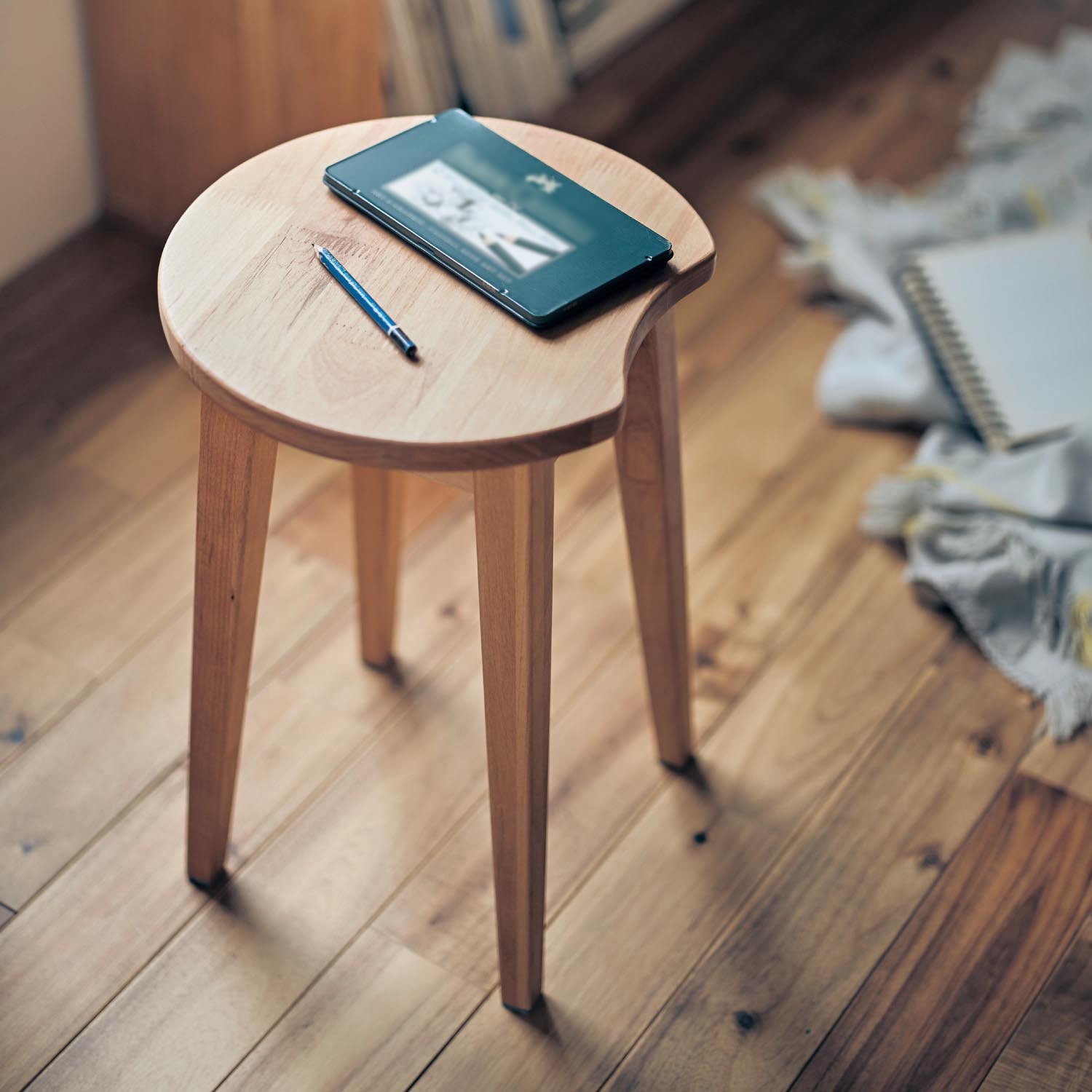 寝室に購入しました。トップが平らなので、座る以外にちょっと物を置くのにも便利です。天然木でナチュラルな風合いが気に入っています。部屋がとてもおしゃれな雰囲気になります。