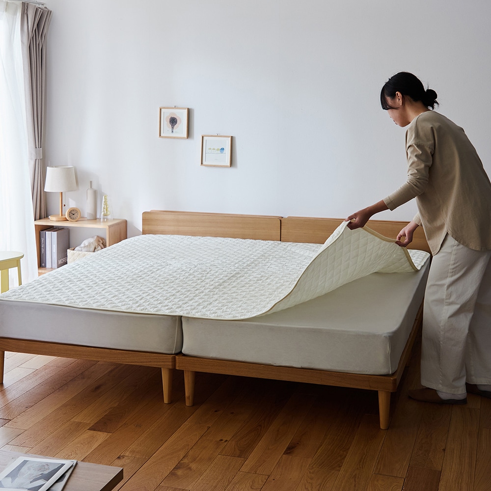 わが家では、実際のベッドより、2サイズアップで購入しています。そうすると、マットのサイド部分もカバーするので一体感がありますし、さらにズレにくいように感じています。今年は白系がお気に入りです。