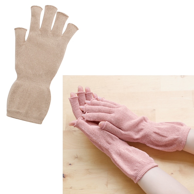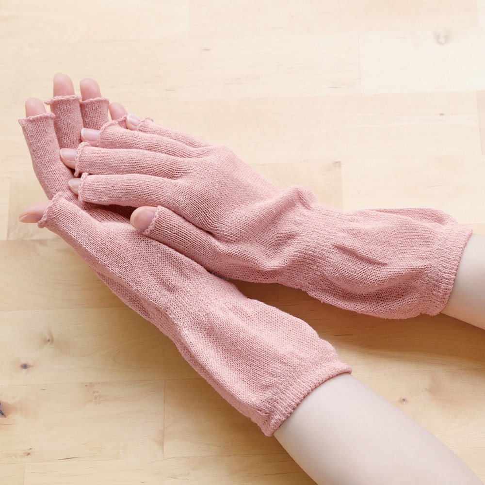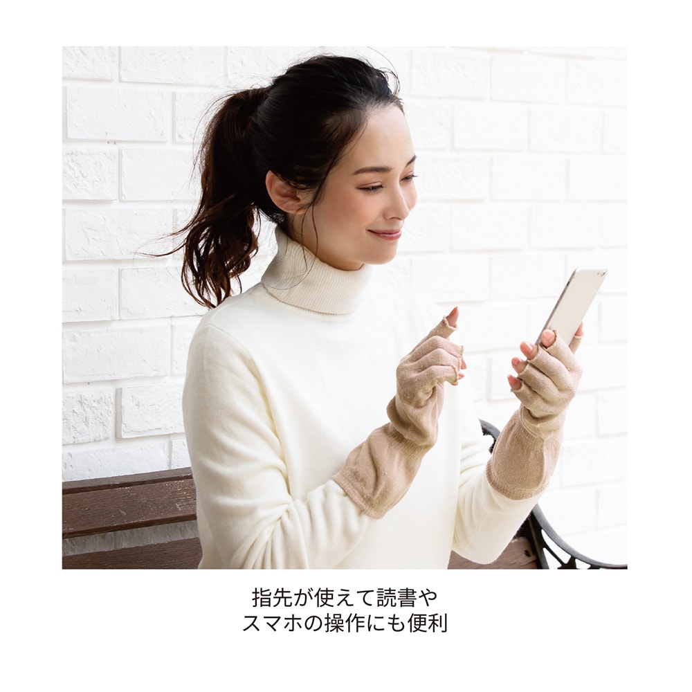 手荒れのケアや手元の冷え対策に便利なシルク100%のハンドウォーマーです。度重なる手洗いや消毒で負担が多くなった手肌を優しく包み込みます。薄くても温かく、ごわつきません。