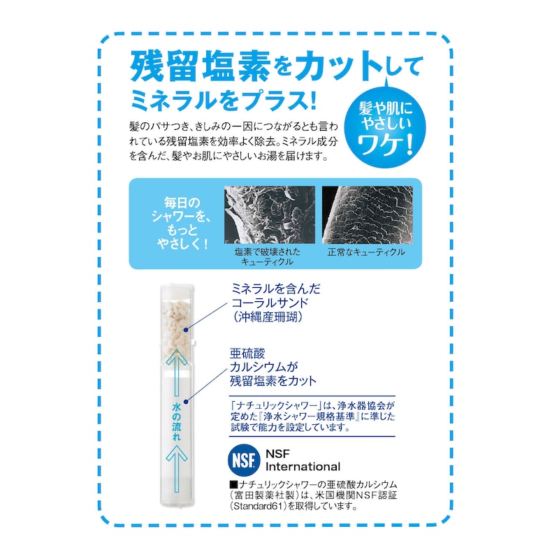 ●髪のパサつき、きしみの一因とも言われている残留塩素を、粒状の亜硫酸カルシウムが効率よく除去