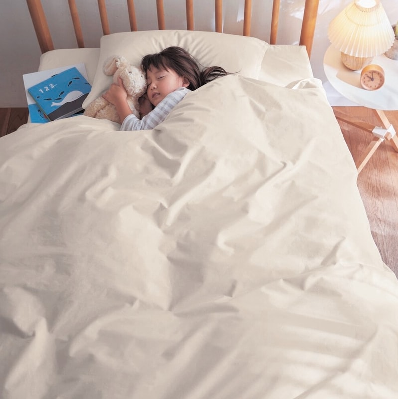 軽い掛け布団にカバーをかけて重くなるのが嫌で しばらくはカバー無しで使っていたのですが やはりカバーがないと不便だなぁと探していたところ レビューを見て購入。 綿なのに値段も手頃で重くなく サラッとした肌触りで 布団の掛け心地が良くなりました。 以前 購入した綿のニット素材のカバーが思っていたより重くて残念だったので カバーも重さのグラム表記があると助かります。
