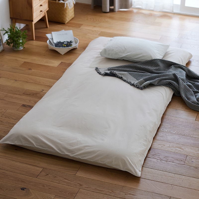 綿素材で肌触りよく、布団を丸ごと覆うタイプのカバーなのでずれを気にすることなく敷いたり畳んでしまったりできてストレスフリーです!