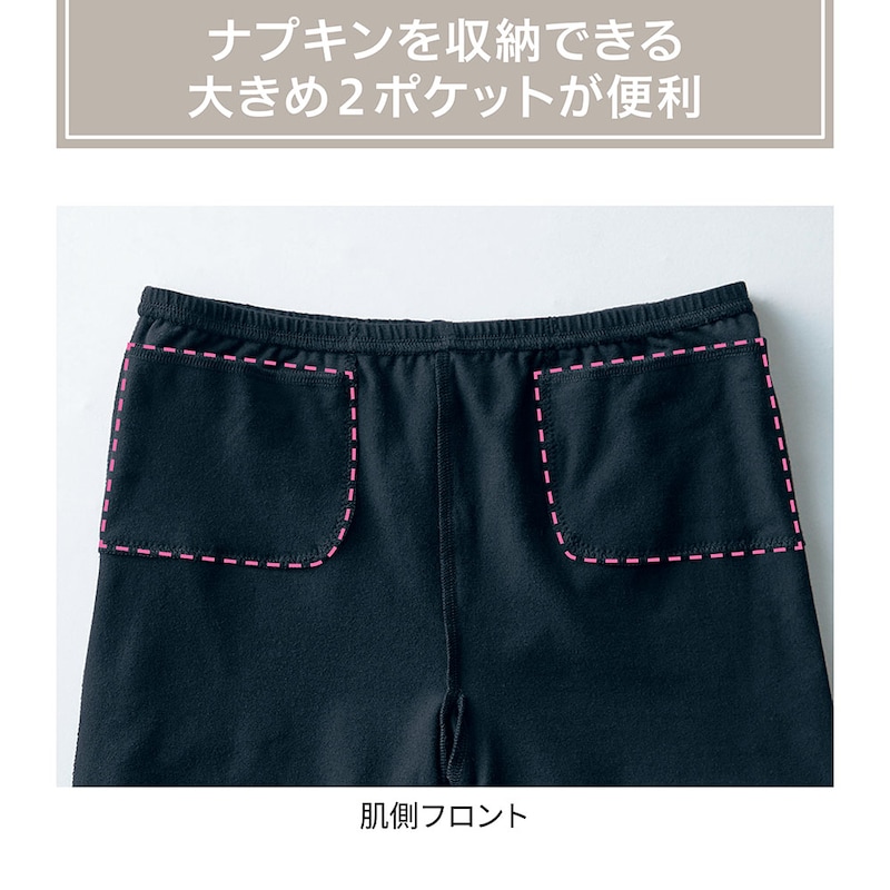 まだ普段のオーバーパンツとしての使用しかしておらず、ポケットの使用感はわからないですが、ポケットの大きさ的に普通サイズのナプキンも入りそうで安心。また厚み的にベルメゾンさんの1分丈スパッツとホットコットのオーバパンツの中間くらいの厚さで通年通して使用できそうでよかったです。