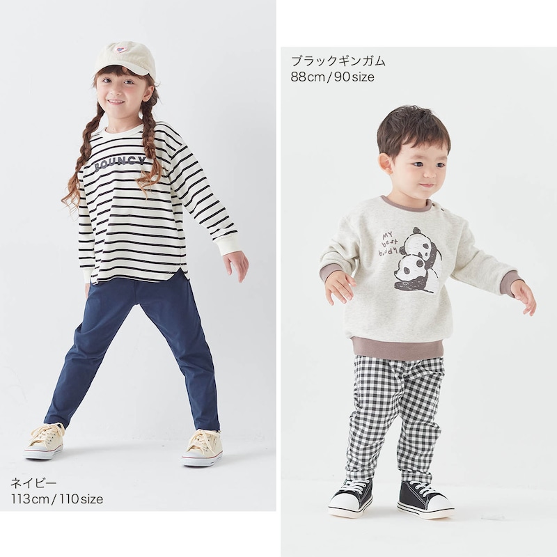 もうすぐ2歳、84センチ10キロくらいのアクティブな女の子です。どんな服にも割と合うブラックギンガムは、手持ちの服に合いやすく、重宝していきそう。まだ体格が小さいので、ウエストもややずり落ちもあり、少し折って履かせていますが、よく似合います。ゆったりした作りで脱ぎ着が楽だし、服のラインもキレイです。もう少し、茶系や他の色柄があったら、また買いたい。因みに、夏場で、外遊びでも大丈夫なように着てます。