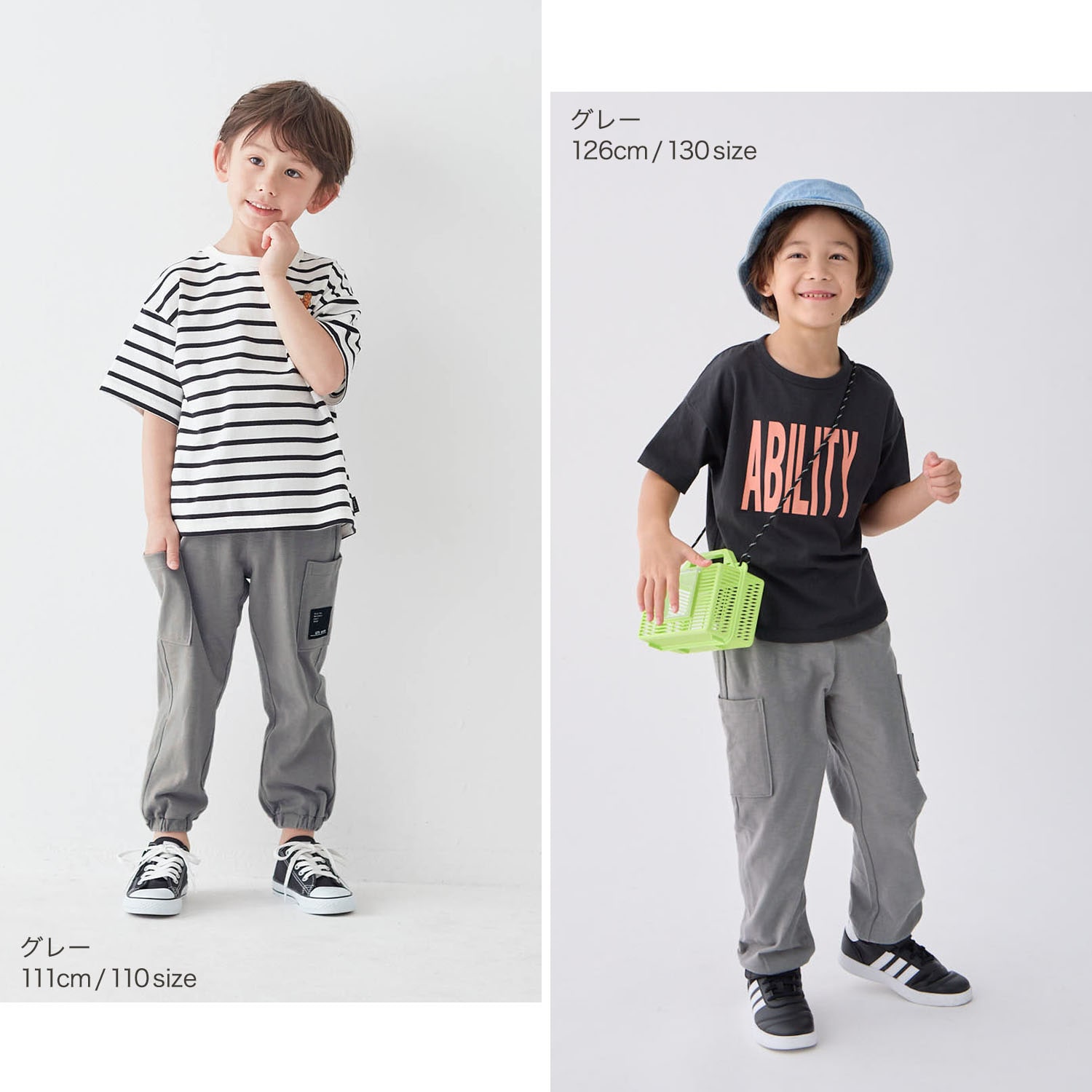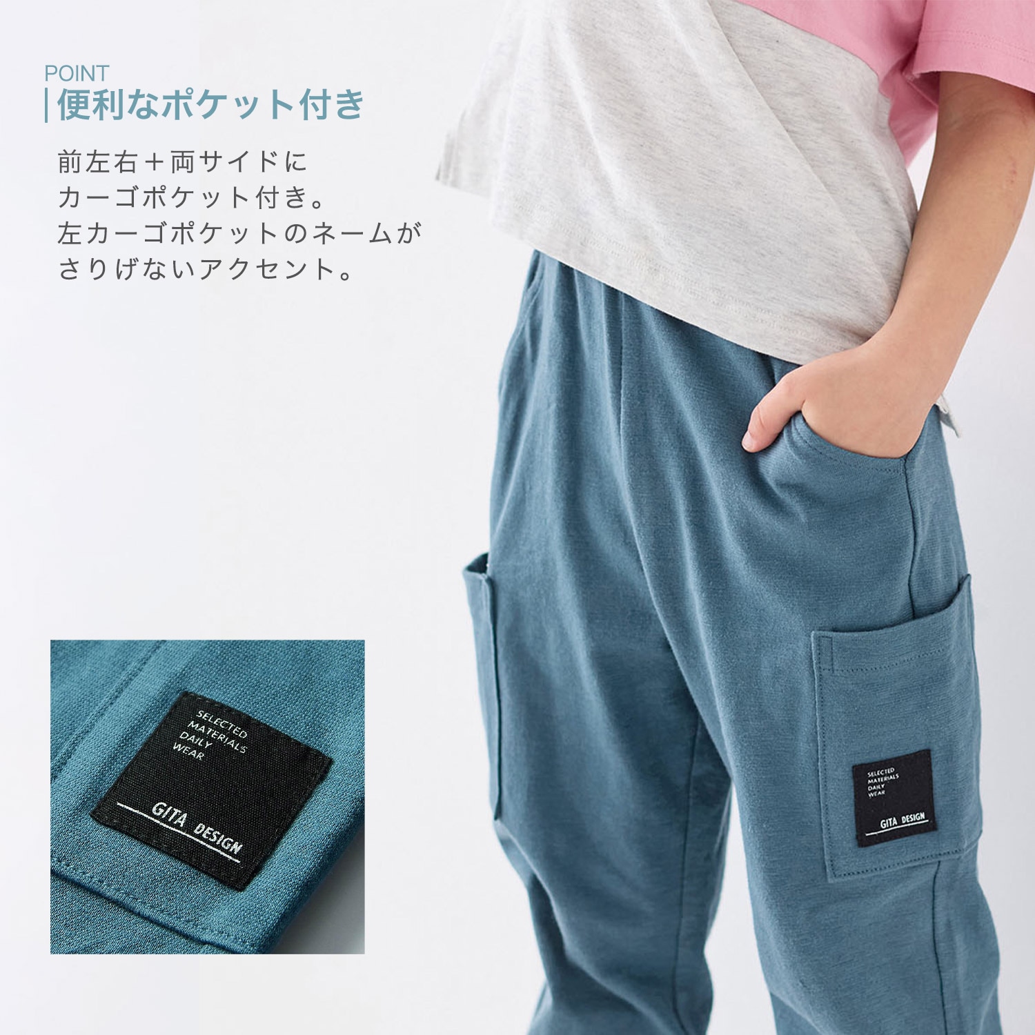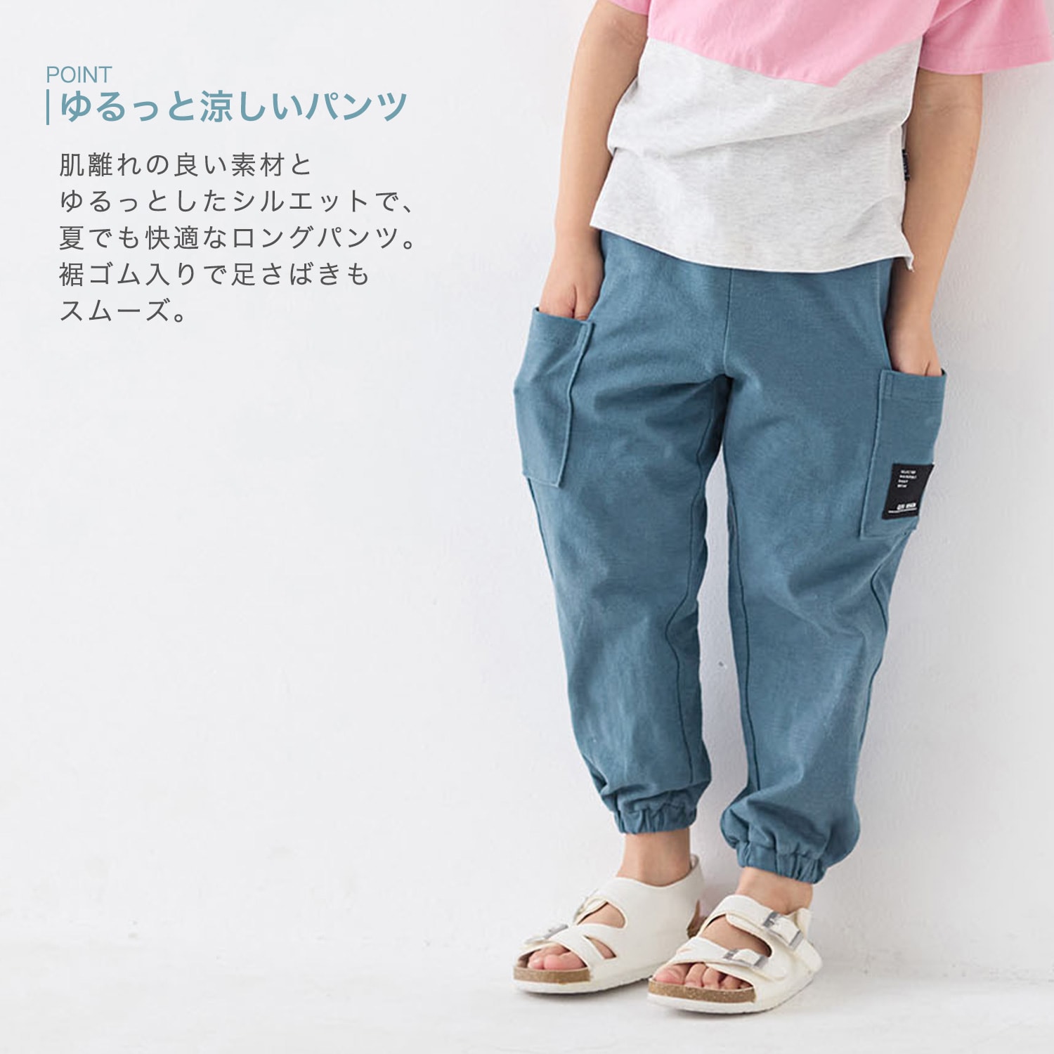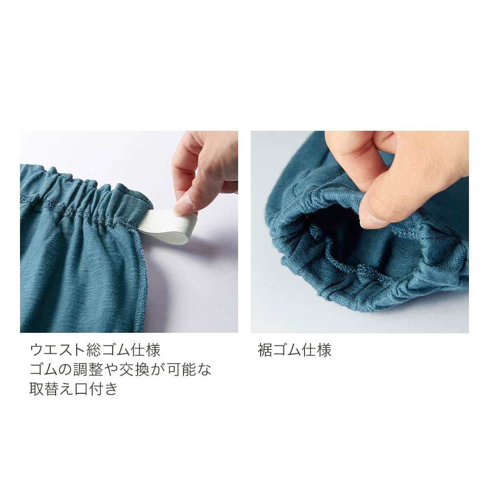 9分丈で裾ゴム仕様なので、132cmの息子が履いても裾を引きずらないので、良い感じです。