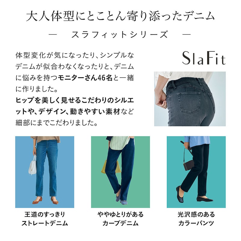 以前、スラフィットデニムパンツのフィット感に大満足したので、色違いで3色購入しました。このたび、カラーパンツが発売されたので、迷いなく購入しました。体系は人それぞれですので、一概には言えませんが、私にはぴったりで大満足です。生地も良いと思います。表面はコットンライクですが、商品説明のとおり、裏面はさらりとしていて、汗ばむ季節にも快適に着用できそうです。また、とてもやわらかく、着心地が良いです。今後、他の色を作っていただけることを強く願います。