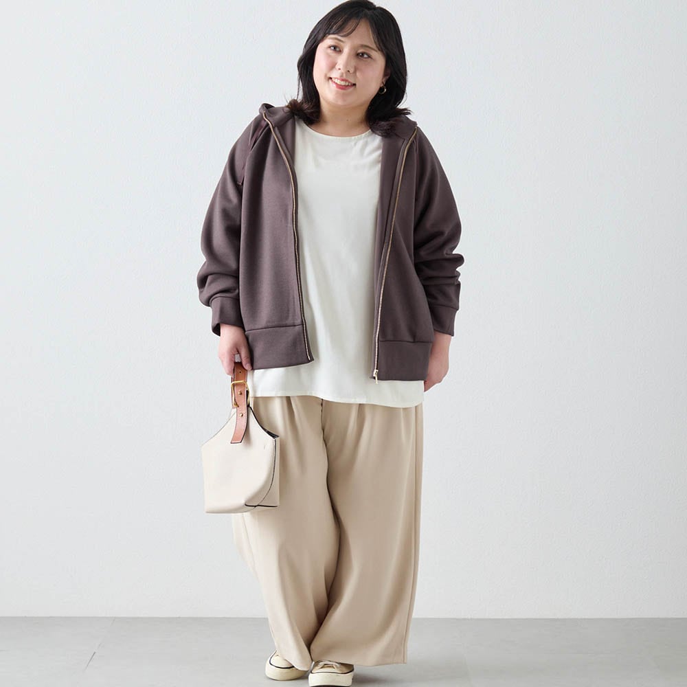 プラスサイズなので、大きなサイズ展開は本当に有難い。大きいサイズでもこの丈感は嬉しい。バランスの悪い体型の為、先ずは6Lを試着。若干柔らかいウェットスーツの様な?張りのある生地なので、ファスナーを全部閉めるとそもそもの体型のせいもあり何だか凄く[膨らむ感じ]がする。それでサイズダウンしていただきました。この生地なので、首周りの立ち上がりは綺麗で気に入ってます。フードのテープはアクセントですね。イマドキなので、還暦過ぎにこの袖が長い。若い子だと長めの袖はカワイイですが、グレージュで汚れ易いので、仕方なく折り返して着ています。季節進んできたので他の色も検討中。まだ洗濯していないので、乾き具合は不明。
