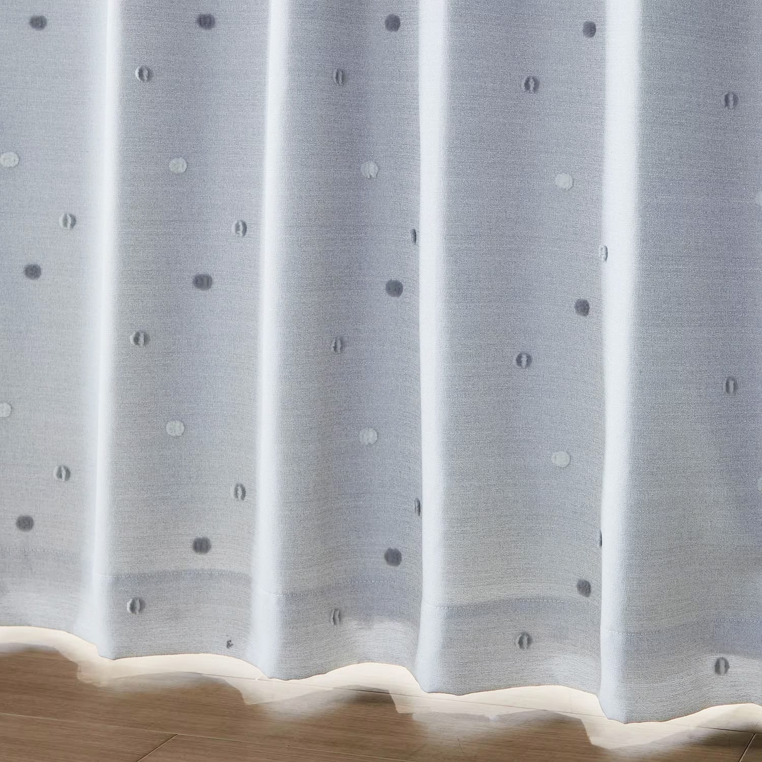 当初は無地のものを探していましたが、立体的なポンポンに惹かれて購入。このポンポンがとても可愛い!可愛いのに、お色が甘いトーンではなく、しかもほんのりなのがすごくいい!地色のアイボリーも、遮光だけど室内が暗くなりすぎずに威圧感も無い。東北地方ですが、朝晩の冷気もかなりシャットアウトしてくれ、部屋が前よりも暖かく感じてます。たぶん、夏の外気もやわらげてくれるのではないかと思います。我が家の5m前が道路なのですが、前のカーテンよりも確かに防音効果があります。