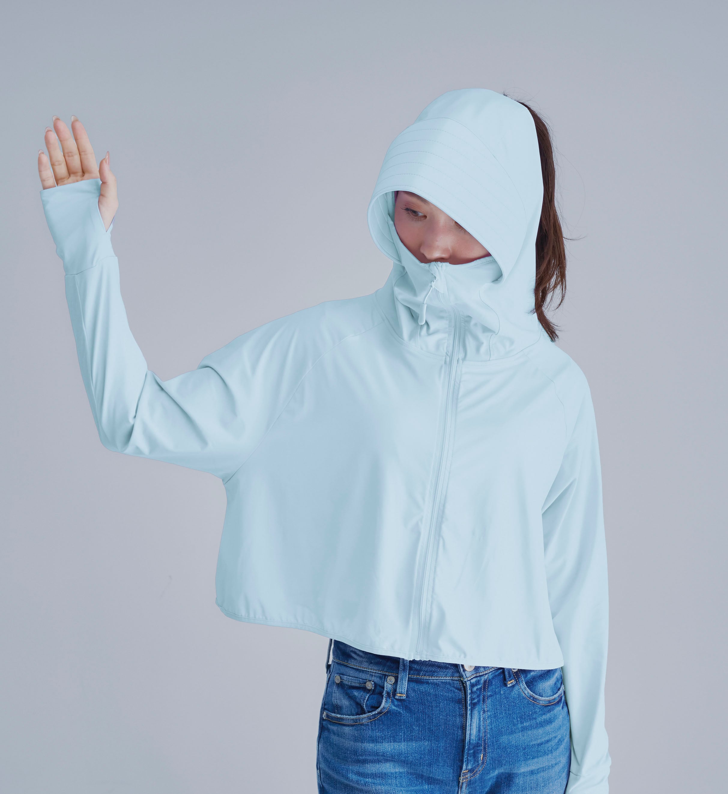 前の生地があがり、もともとショート丈なので、余計丈が短くなります。