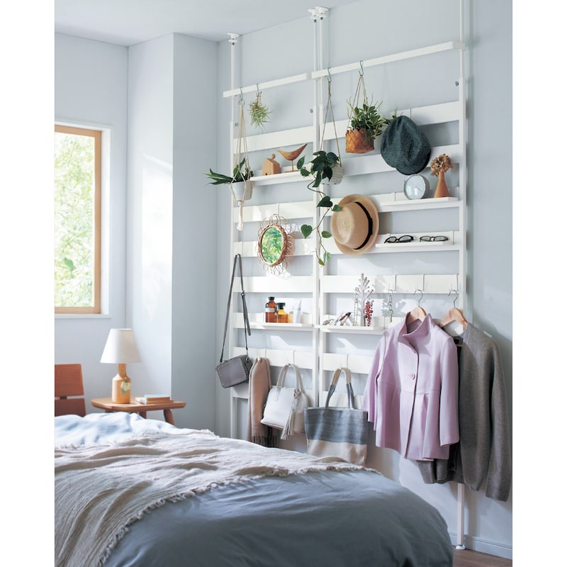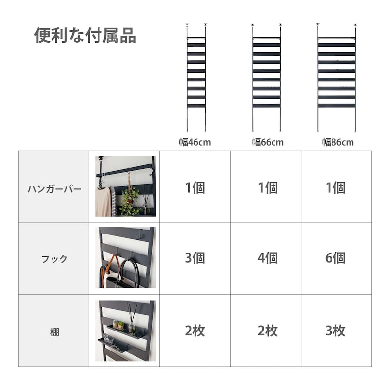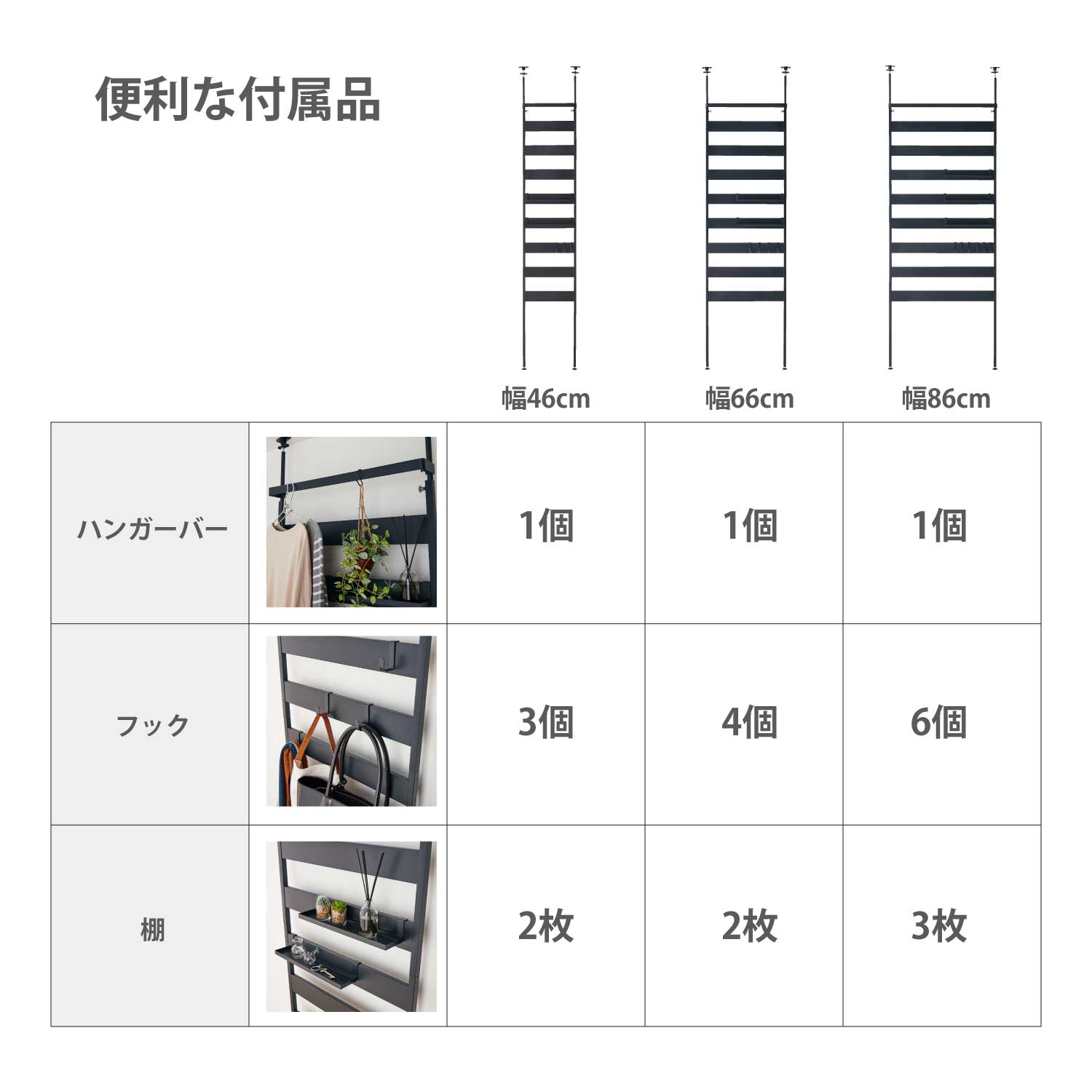 幅86を購入しました。幅が狭いタイプなら一人でも組み立てられるかもしれませんが、このサイズだと重さもあるので一人だと大変だと思います。廊下の壁面に使用しましたが普段よく使うアクセサリー、バッグなどをまとめてかけておけるので便利です。ラックが何個か付いていましたが使っていません。。。