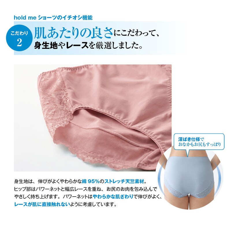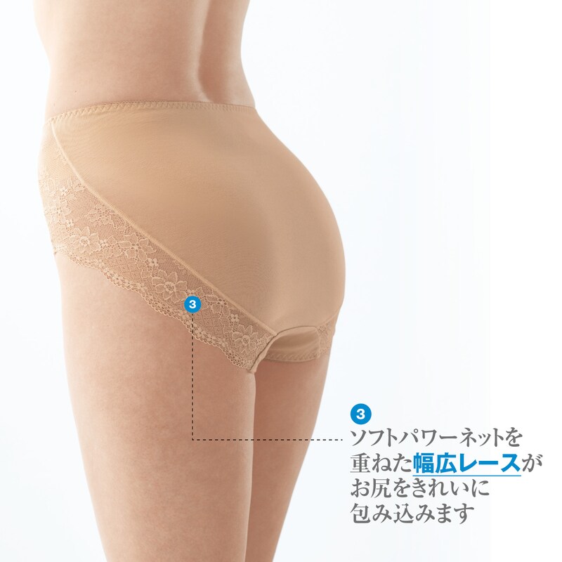 ヒップの足口はパワーネットと幅広レースを重ね、垂れ気味のやわらかいお尻をすっぽり包んで持ち上げます。