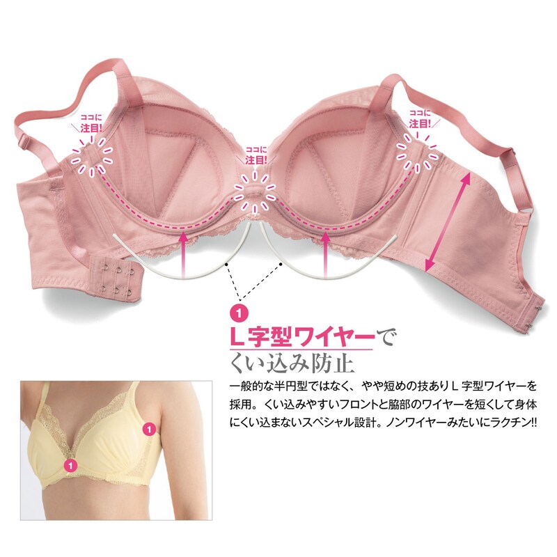 ブラジャーは短めのL字型ワイヤーにして、「谷間と脇にくい込んで痛い」をなくしました。
