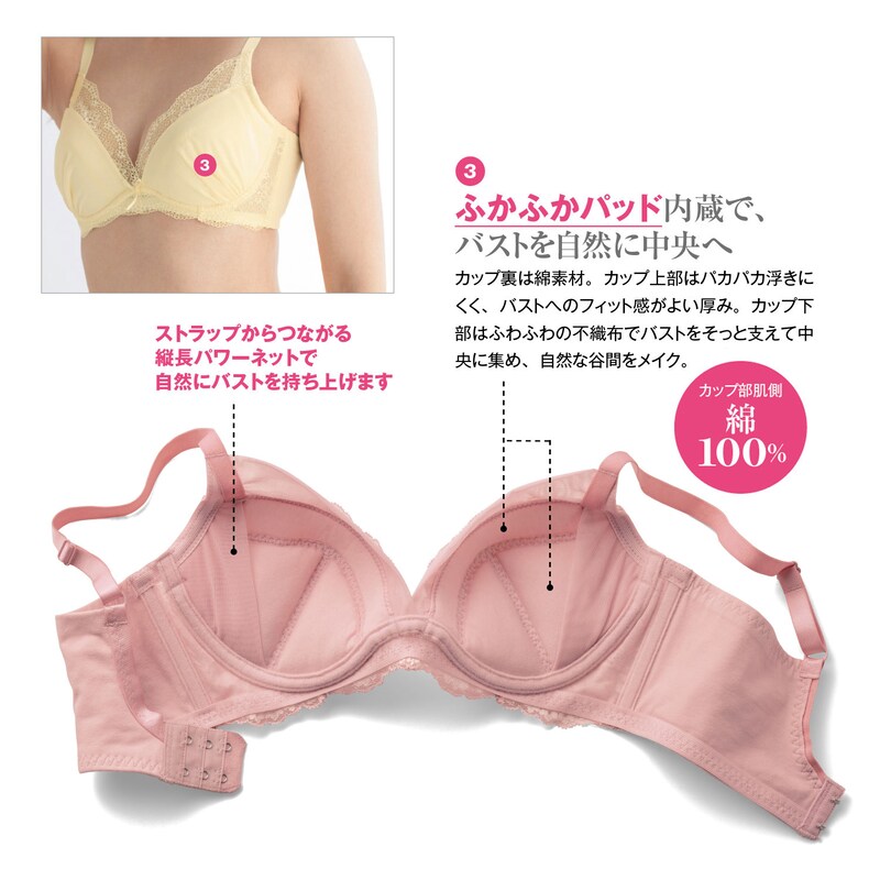 さらにカップ下部もふわふわにして、パッドの厚みでバストをそっと支えます。バストを中央に集め、自然な谷間をメイクしてくれます。