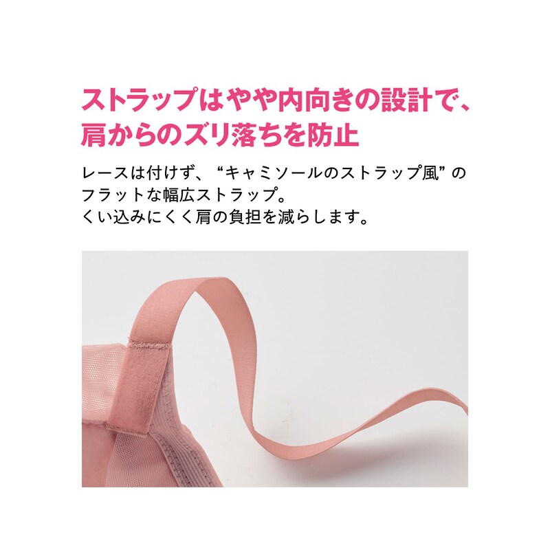 ストラップは、くい込みにくく、肩の負担を減らす仕様に。レースなし“キャミソールのストラップ風”のフラットな幅広タイプを採用。