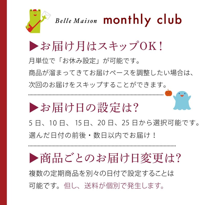 毎月のお届けは 5日、10日、15日、20日、25日から選択可能です。 継続利用のある場合、マイページよりご確認ください。