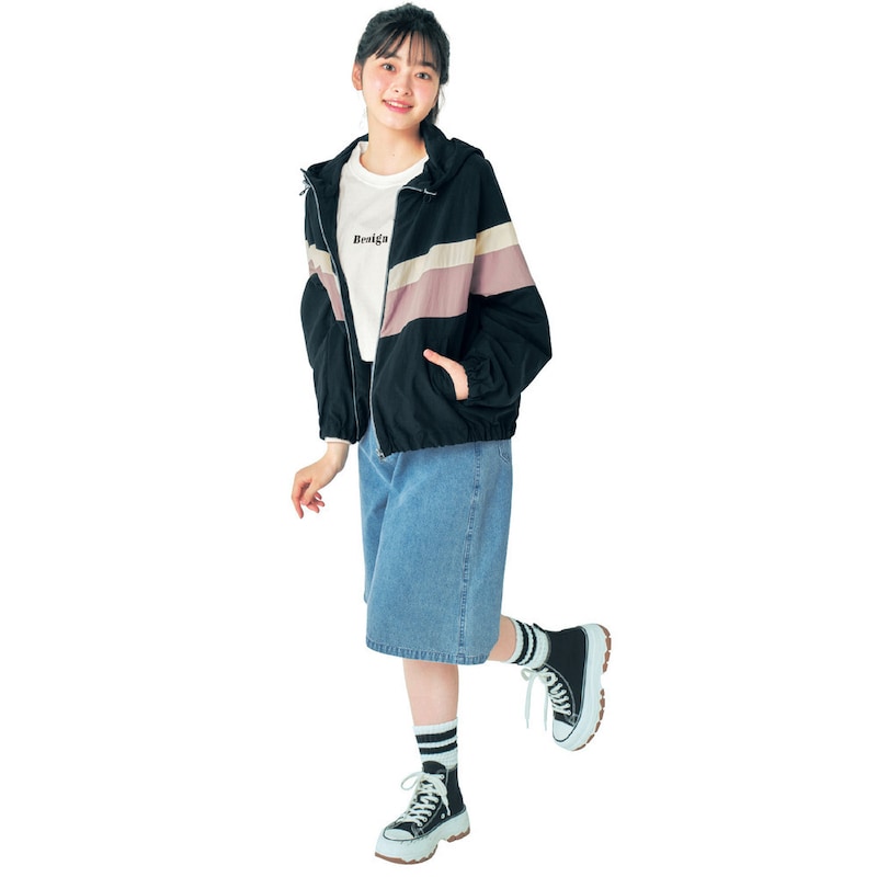 156センチの娘にJSサイズを購入。袖の長さやサイズはちょうどでした。少し大人っぽいデザインで気に入っています。モデルさんと同じ黒のスキニーに合わせて、着用しています。