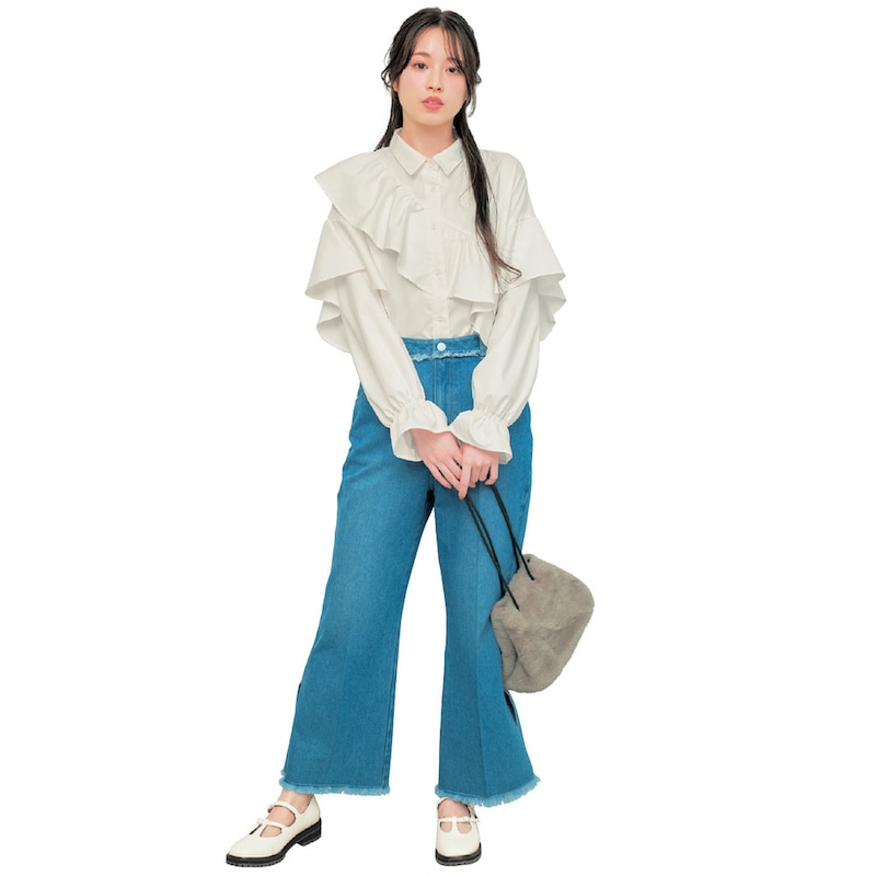 フリンジ使いが鮮度高めな美シルエットのデニムパンツ