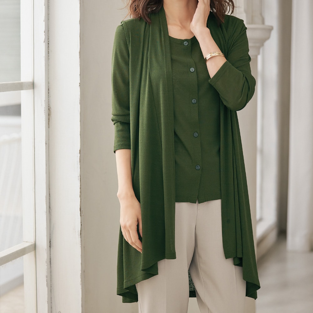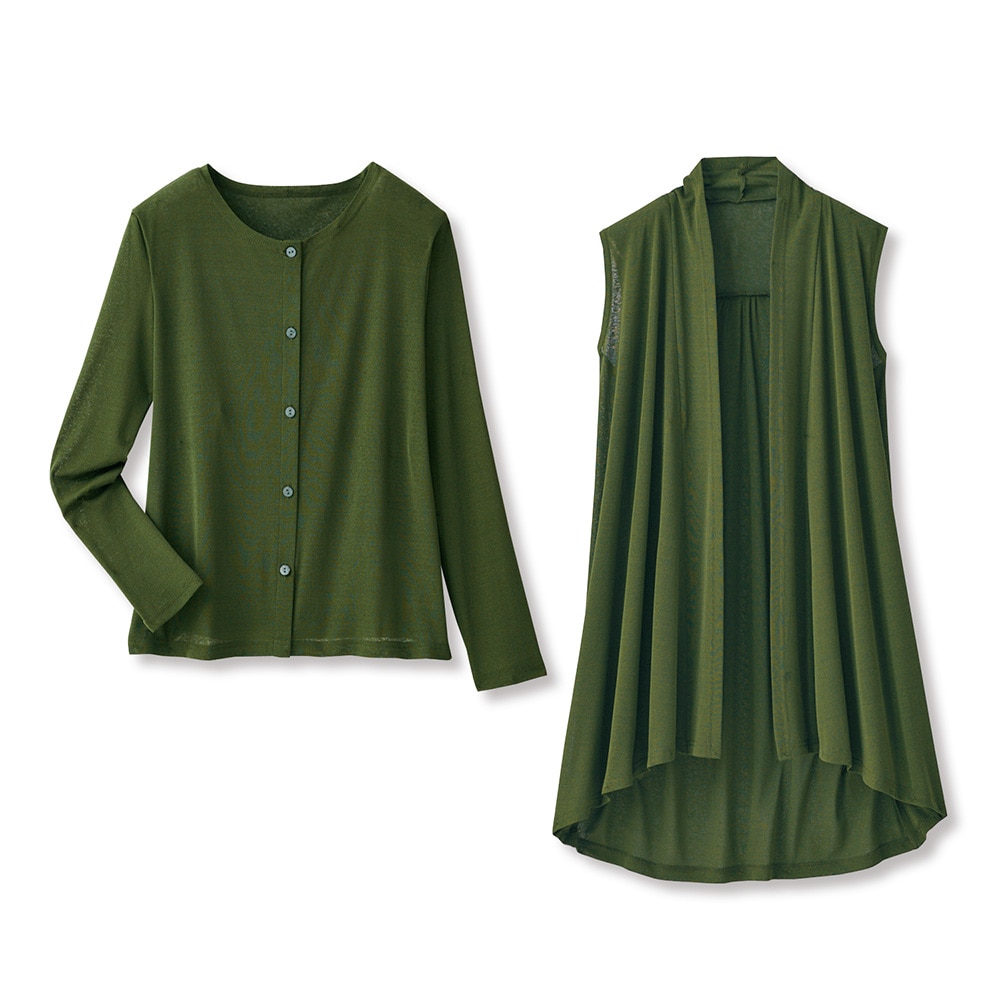 サッと羽織るだけでコーデが決まるロングジレは、さらりとしたカットソー素材だからより軽やか。同素材のカーディガンは羽織り物として、前を閉じてプルオーバーとして、ジレとのアンサンブルのインナーとして、幅広い着こなしが楽しめます。