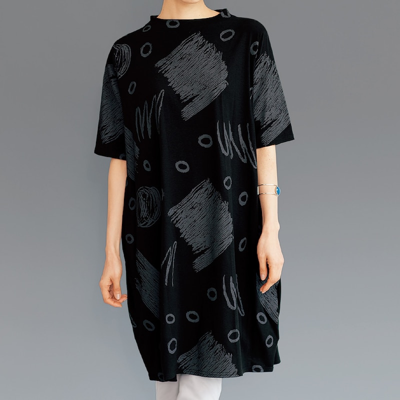 アートな幾何学柄をゆったりコクーンシルエットに