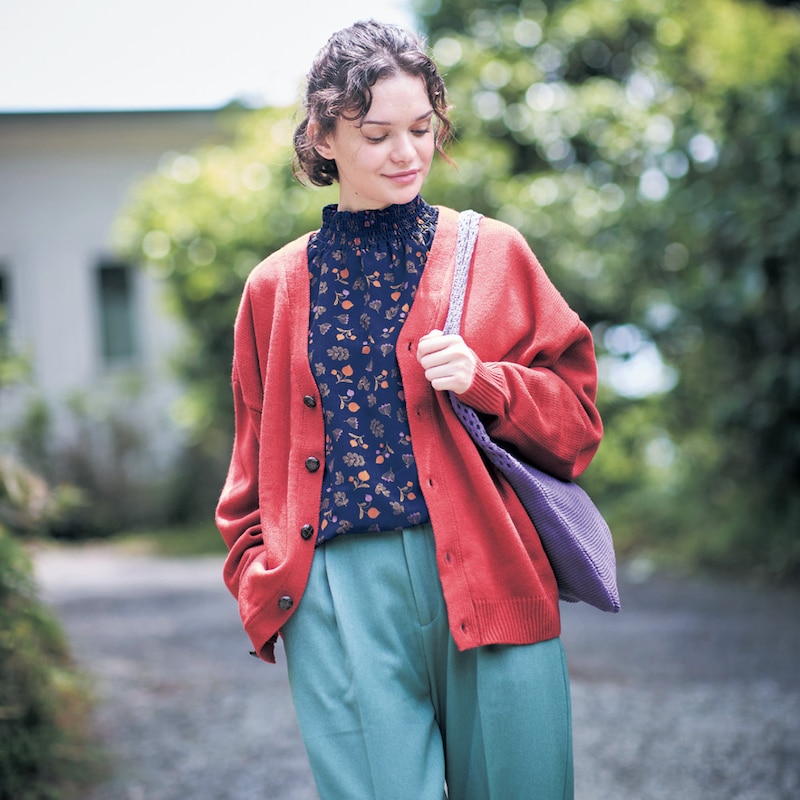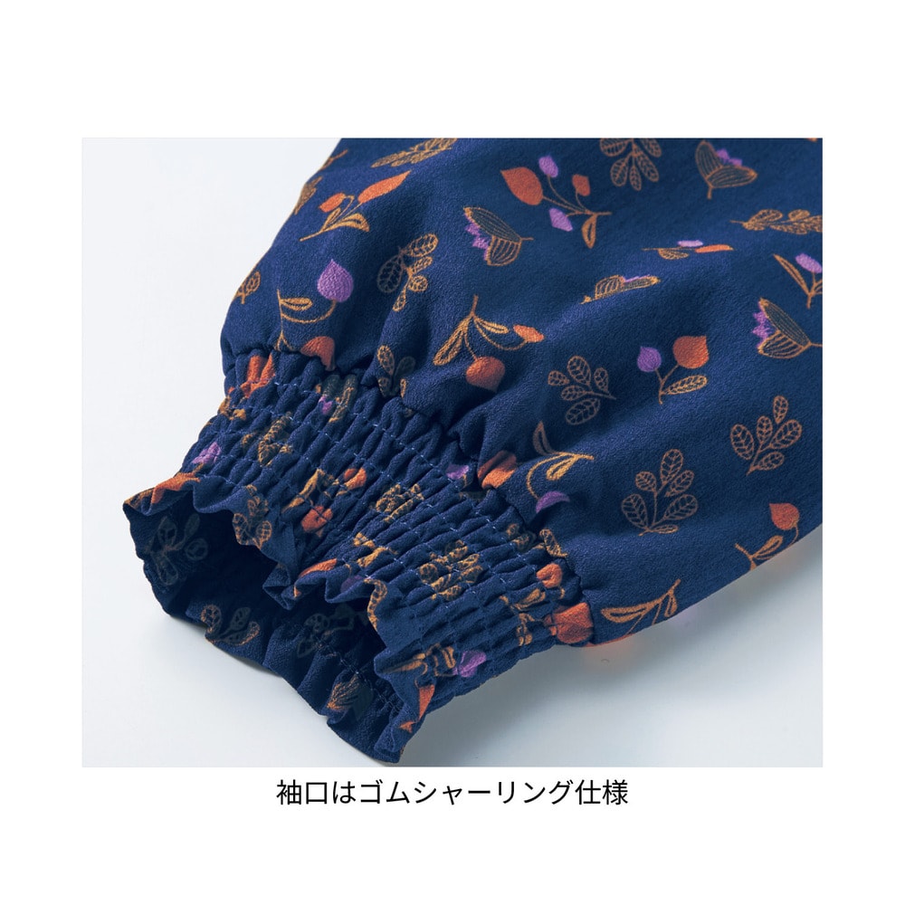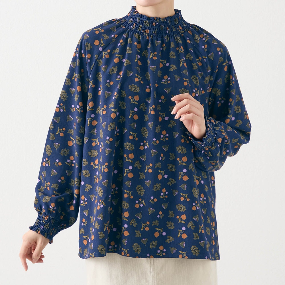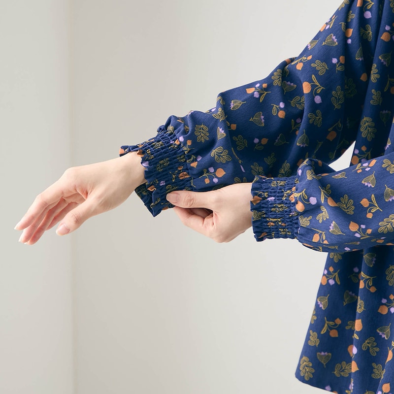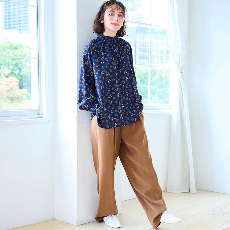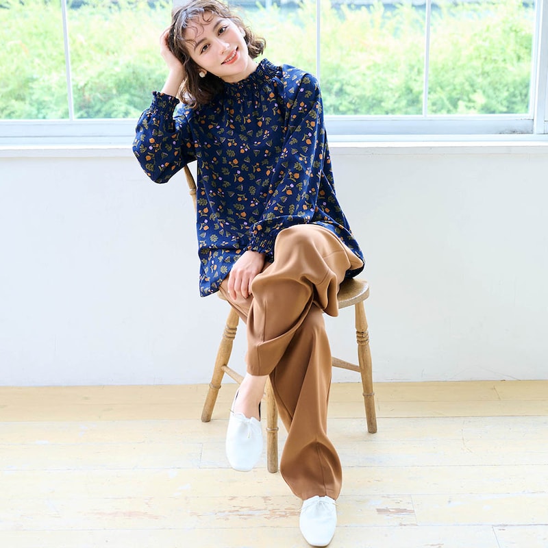子供の頃に着てたなと思わせるデザイン。袖と首もとがシャーリングになっていてかわいいです。若干生地が薄いのでセーターやベストにインしたほうが冬場着回しできそうです。