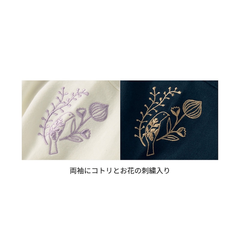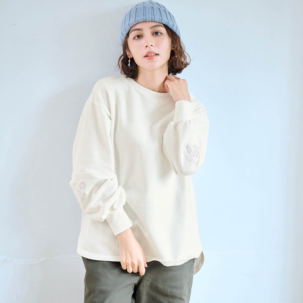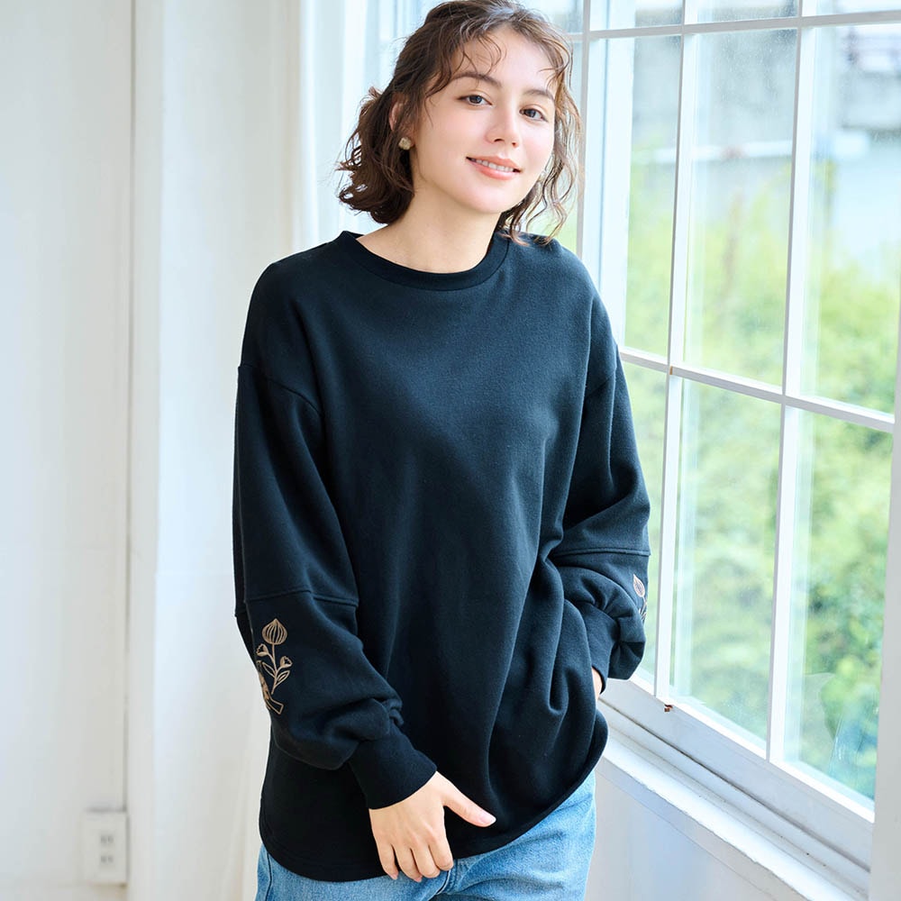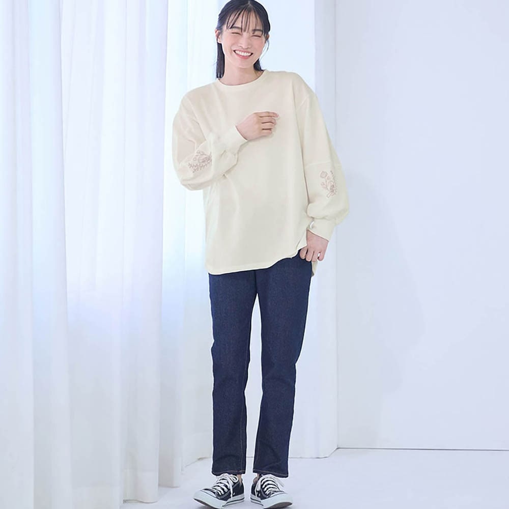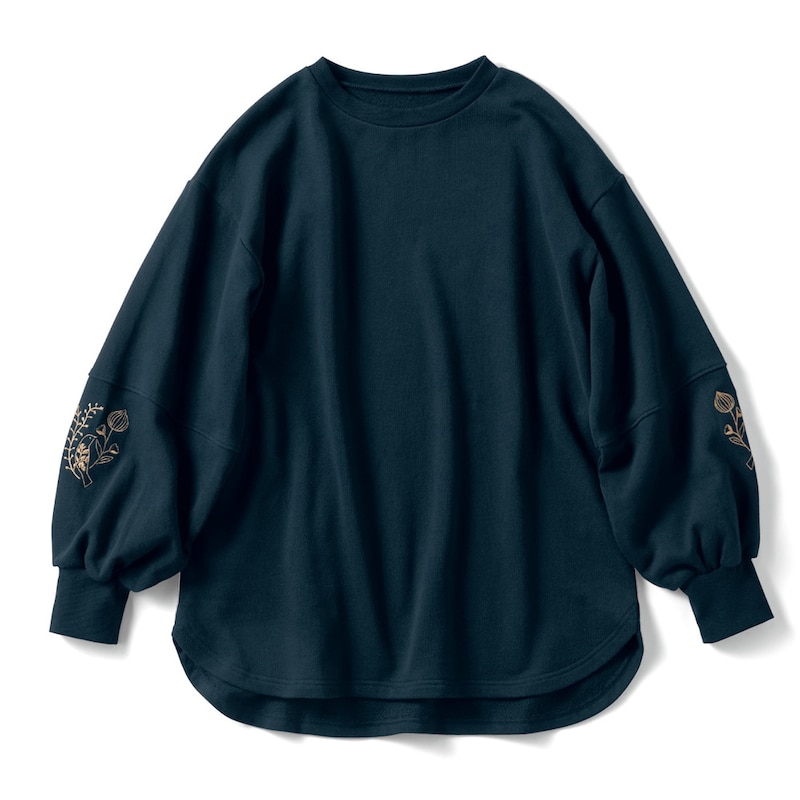 生地は厚すぎず着やすい。袖の刺繍が可愛いいのと着回しができるデザインです。