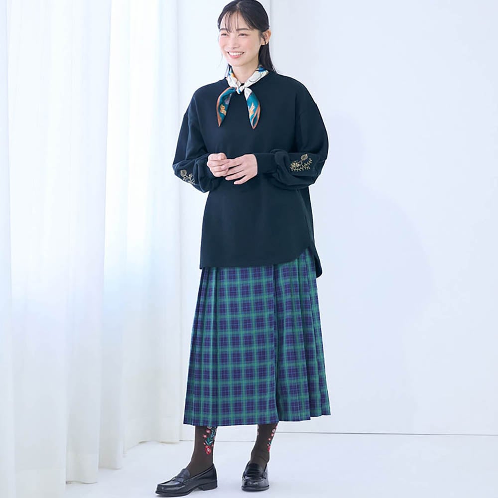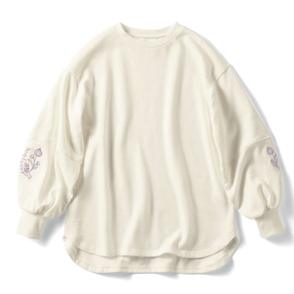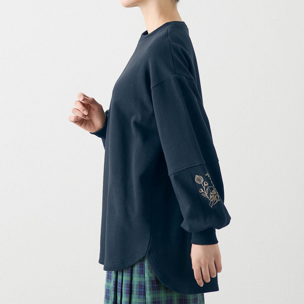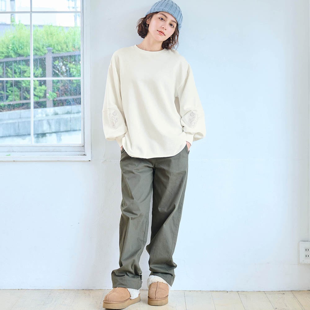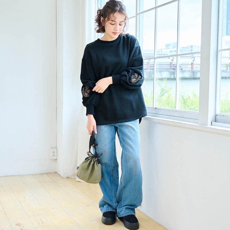 生地は厚すぎず着やすい。袖の刺繍が可愛いいのと着回しができるデザインです。